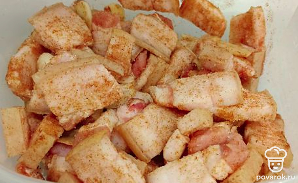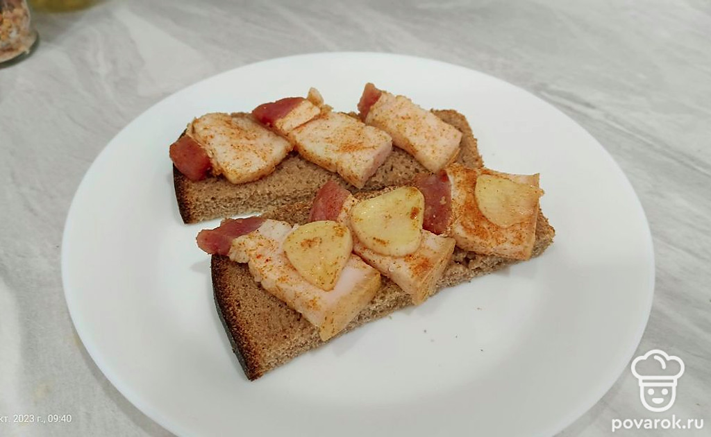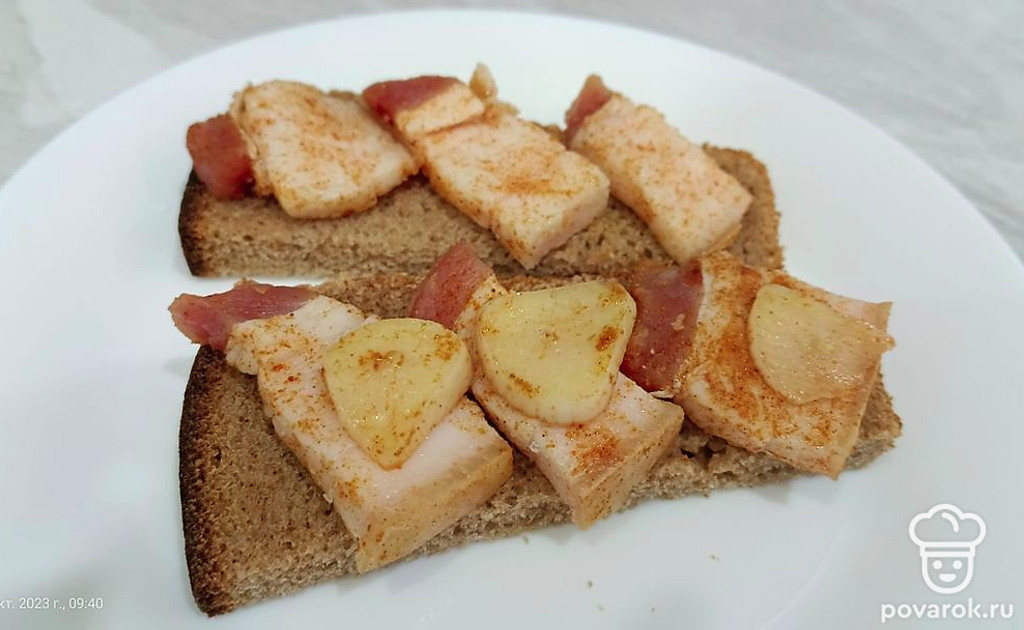 Закрыть крышкой контейнер, потрясти для того, чтобы сало с перемешалось солью, перцем и чесноком равномерно.