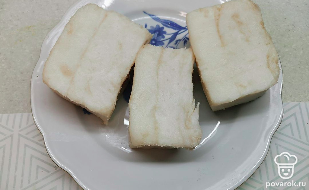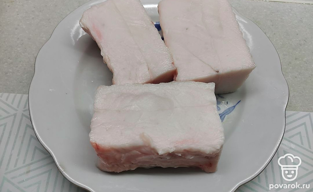 Подготовить сало. Хорошо промыть, срезать шкурку и разрезать на кусочки, удобные для засолки.