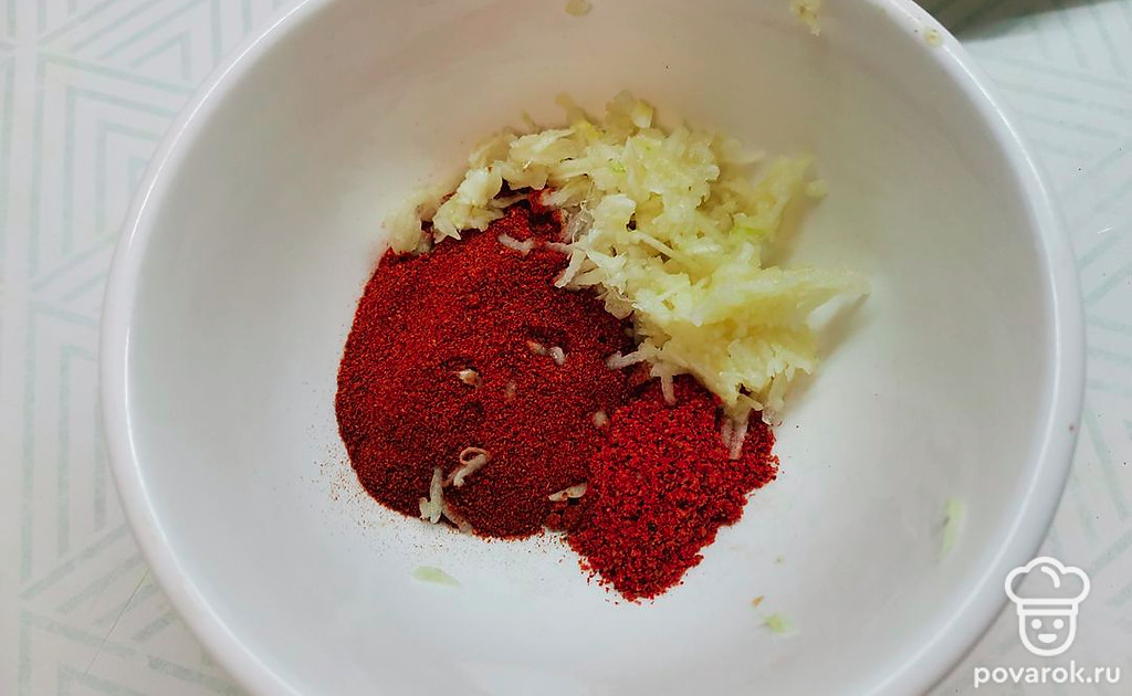 Смешать копченую паприку, красный молотый перец и измельченный чеснок.
