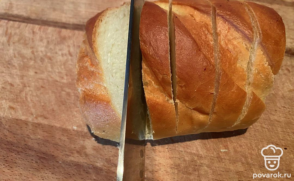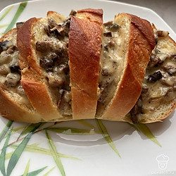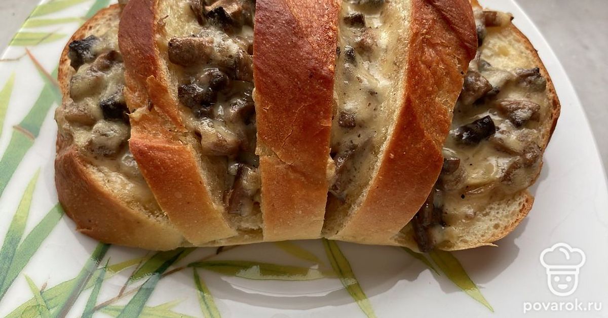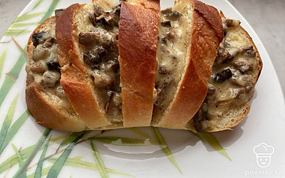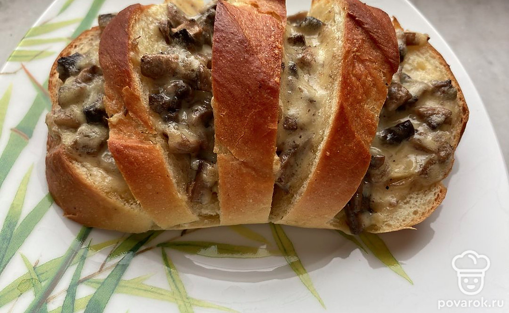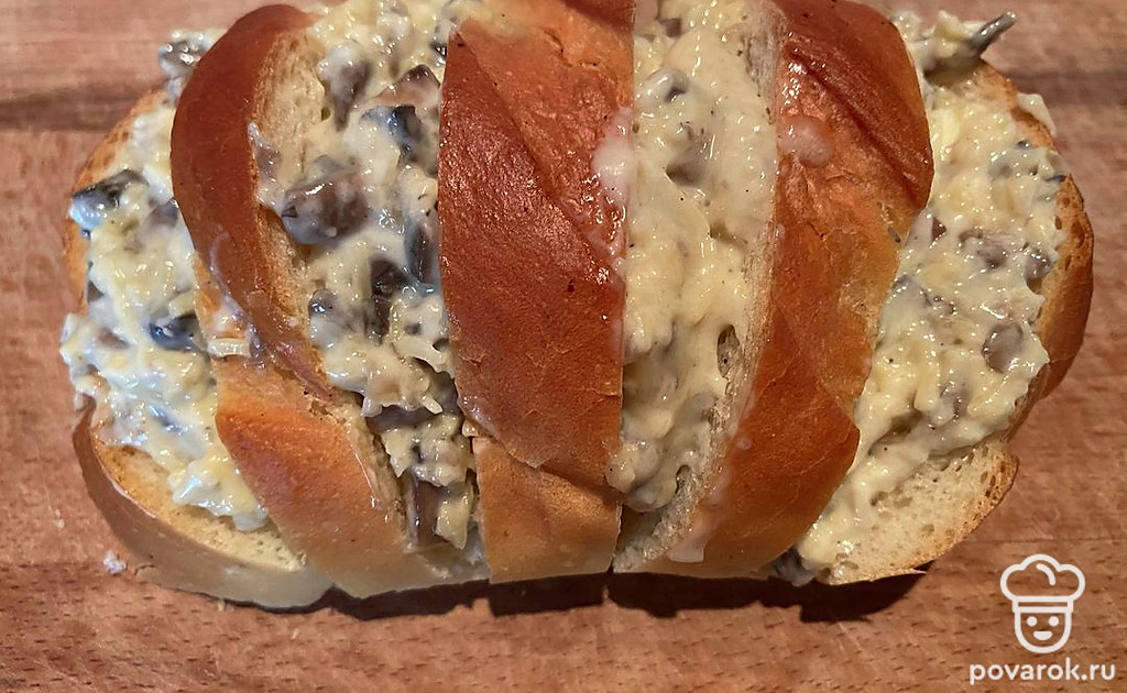 Смажьте батон грибным маслом и отправьте в духовку на 5 минут до румяности.