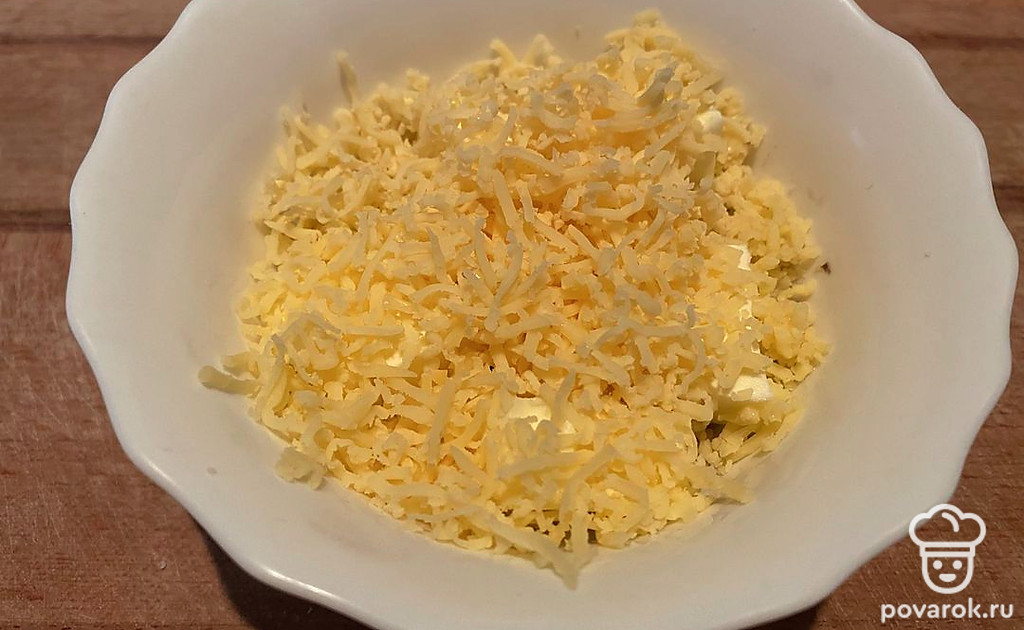 Натрите на мелкой терке сыр и тщательно перемешайте.
