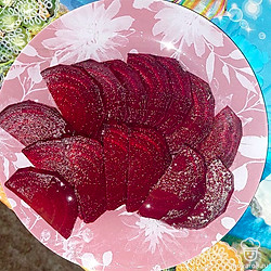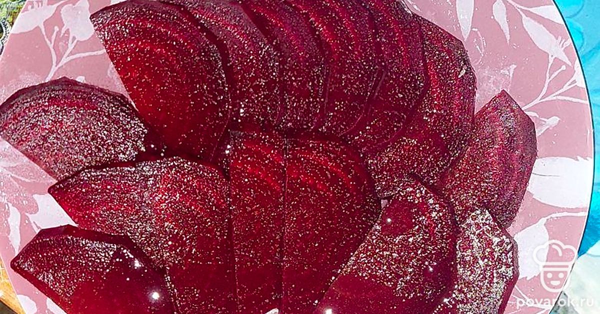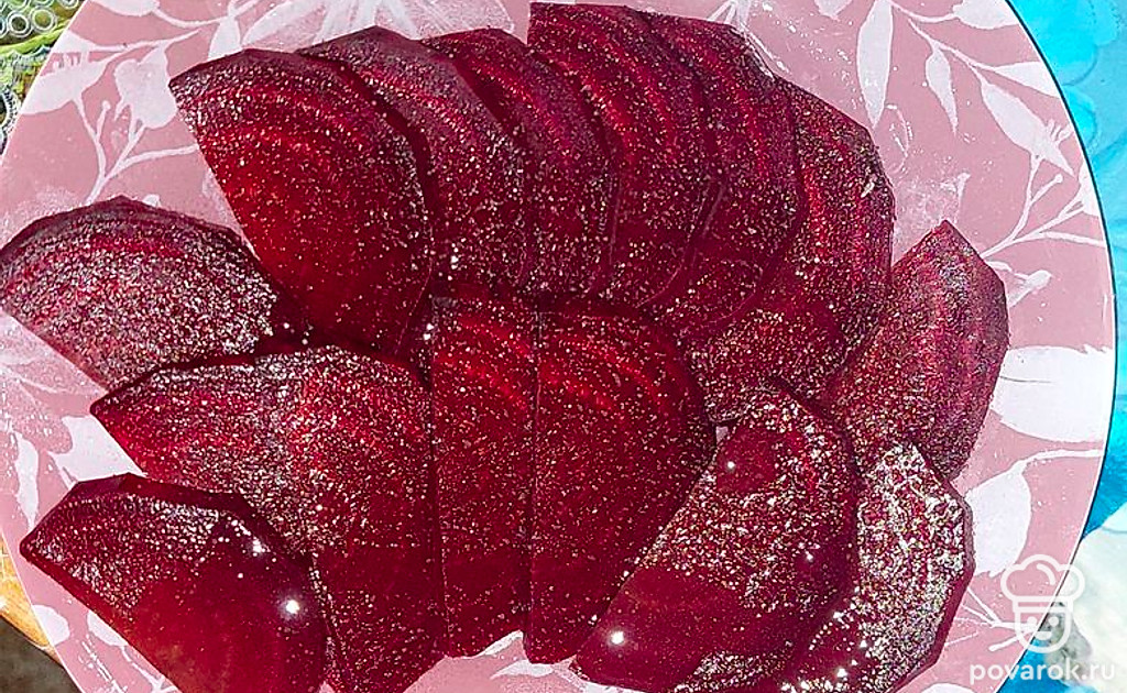 Достаем свеклу, промываем холодной водой. Очищаем ее от кожуры и нарезаем дольками. Дольки поливаем лимонным соком, маслом и солим. Оставляем на 10 минут.