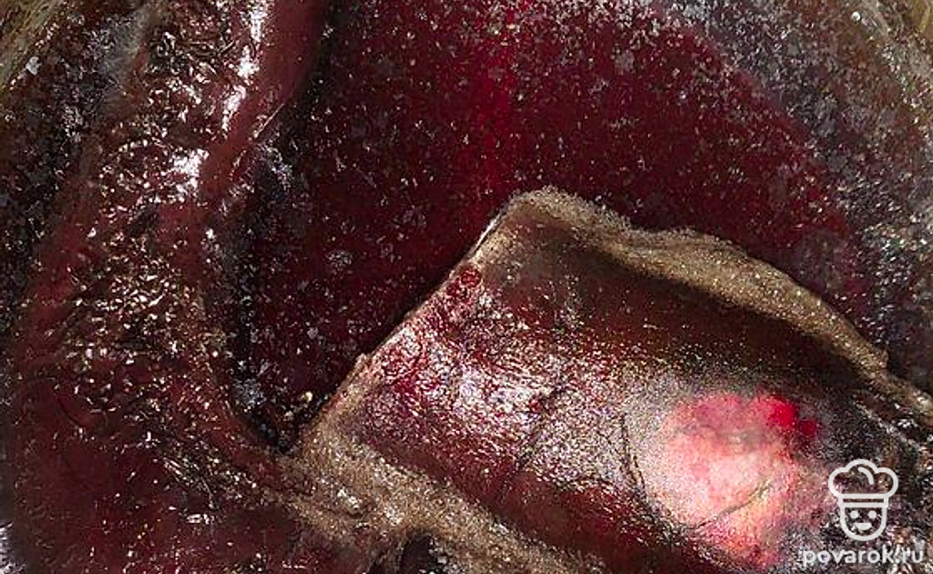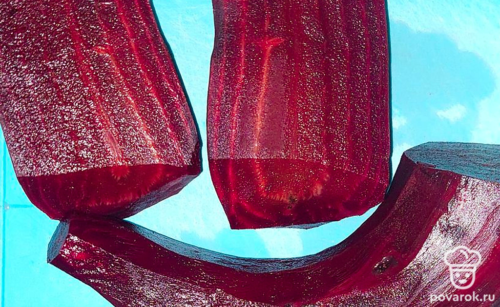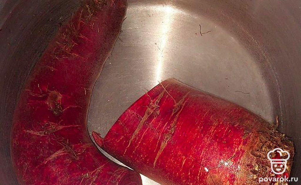 Варим на большом огне (не менее 2,5 часов) под крышкой. Когда свекла сварится, выключаем газ и оставляем свеклу в воде еще на 30 минут.