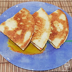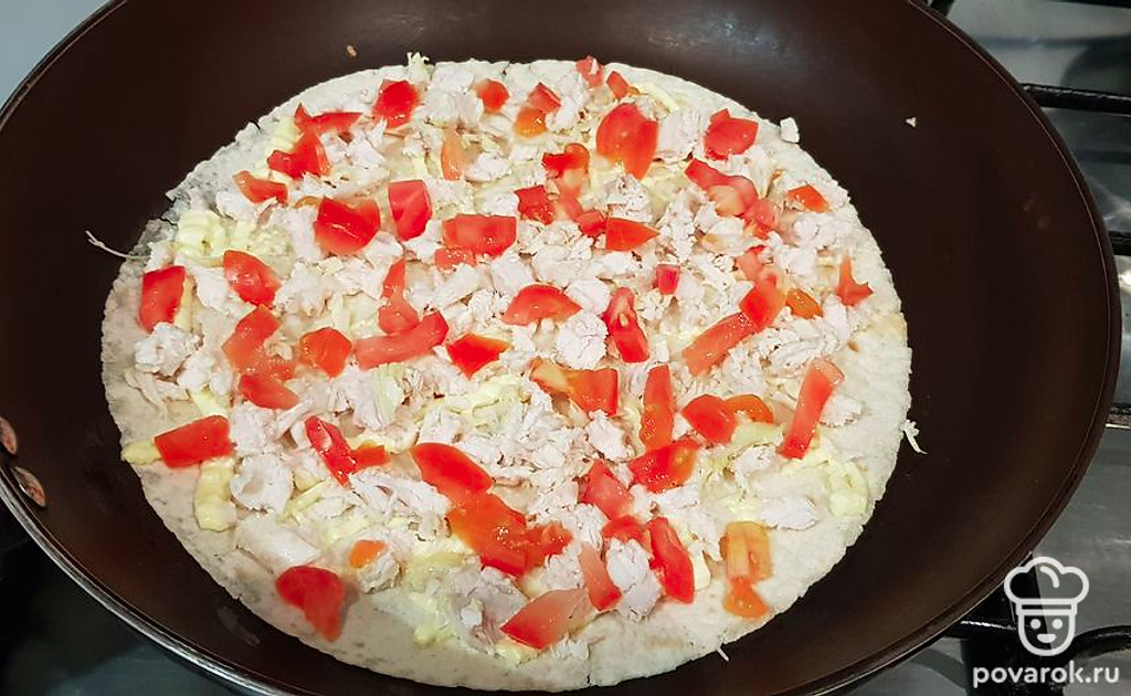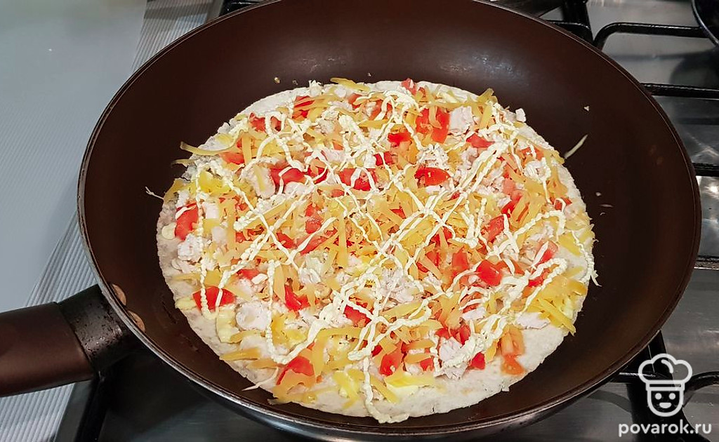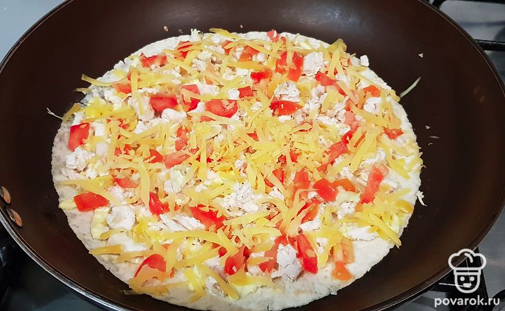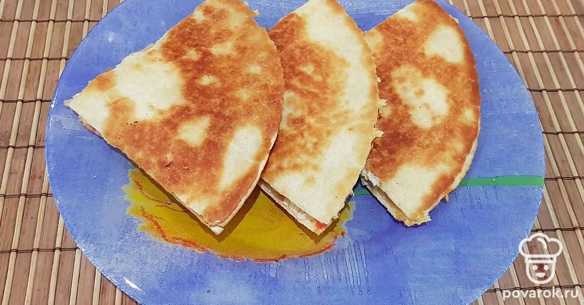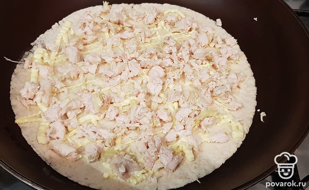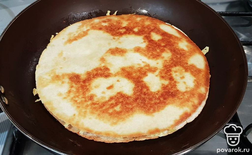 Накрываем второй тортильей и обжариваем с двух сторон до золотистой корочки.