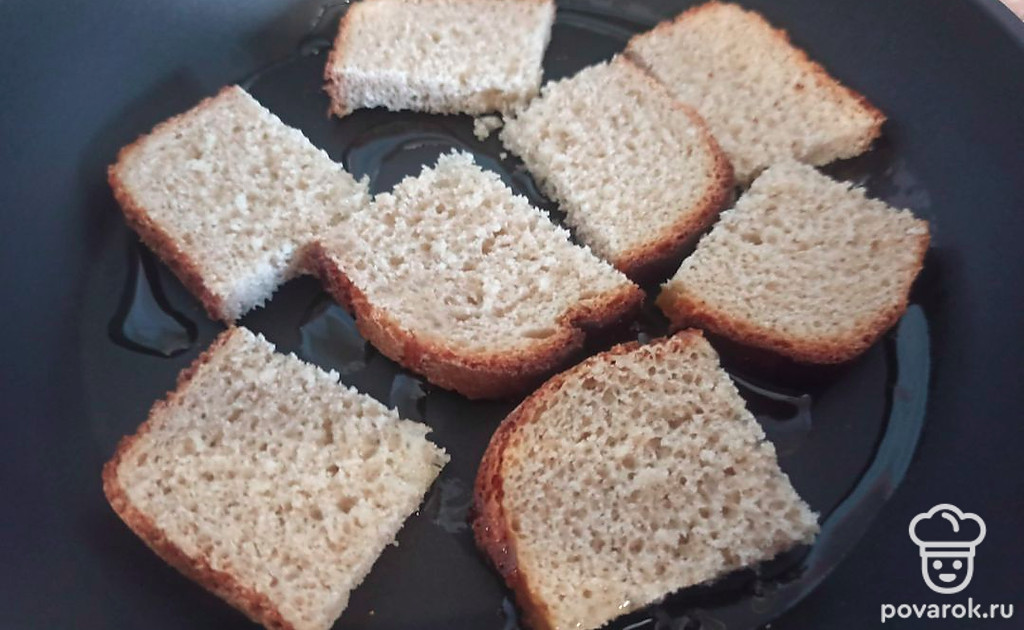Ломтики хлеба разрежьте на 4 части и обжарьте на подсолнечном масле с двух сторон до золотистого цвета в течение 5 минут.