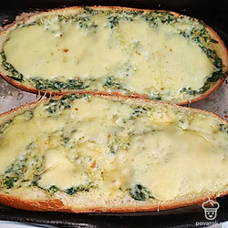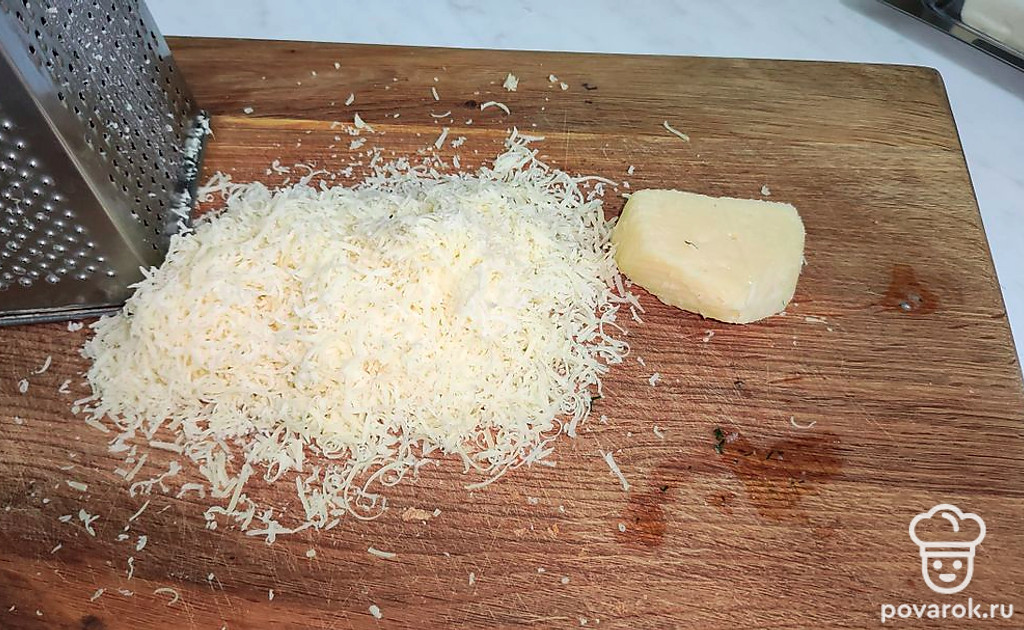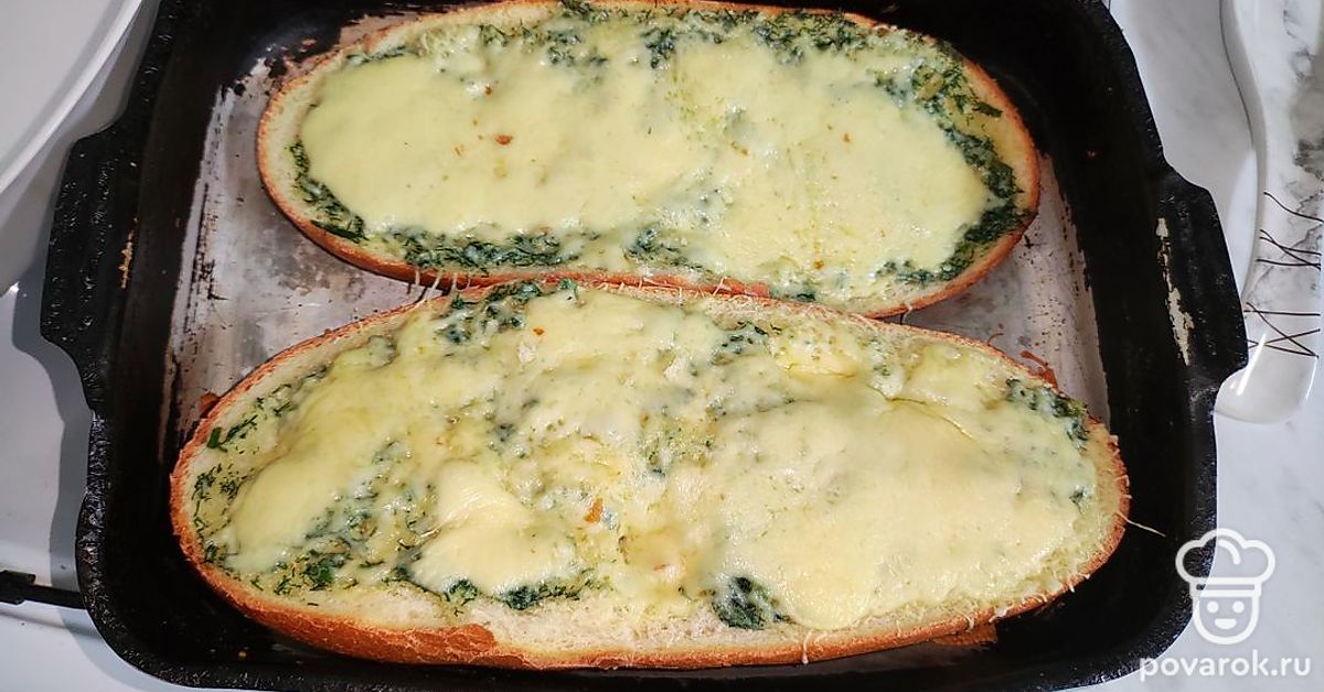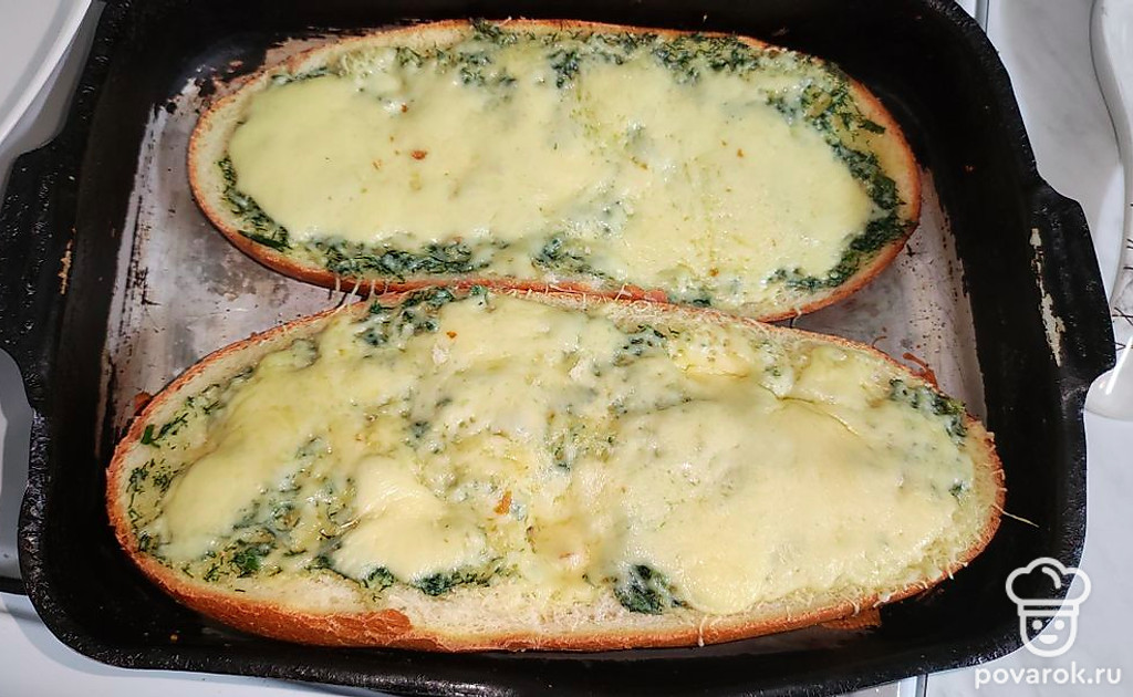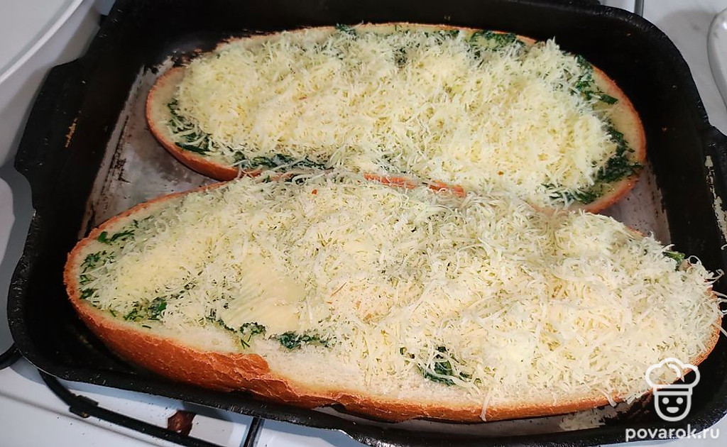 Посыпьте сыром батон. Отправьте противень с батоном в разогретую до 180 градусов духовку на 15 минут.