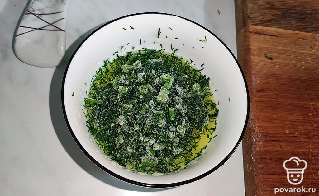 Добавьте к маслу с чесноку мелко нарезанный укроп. Перемешайте.