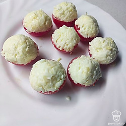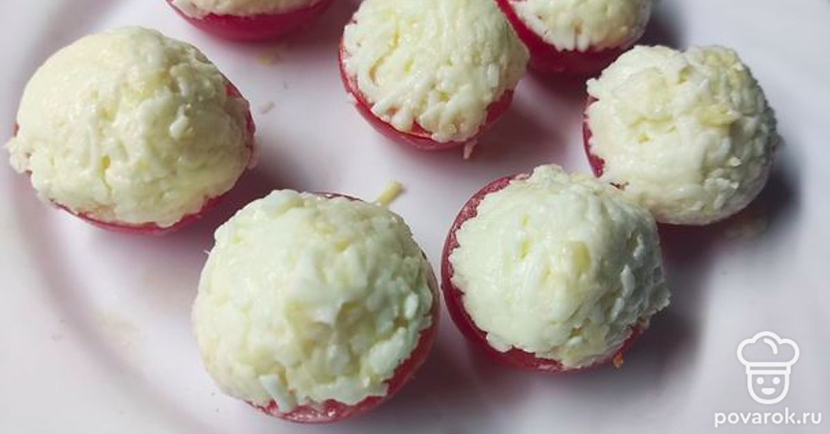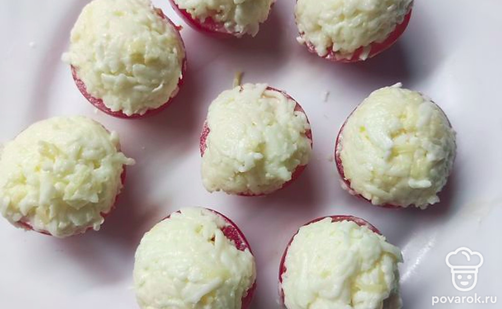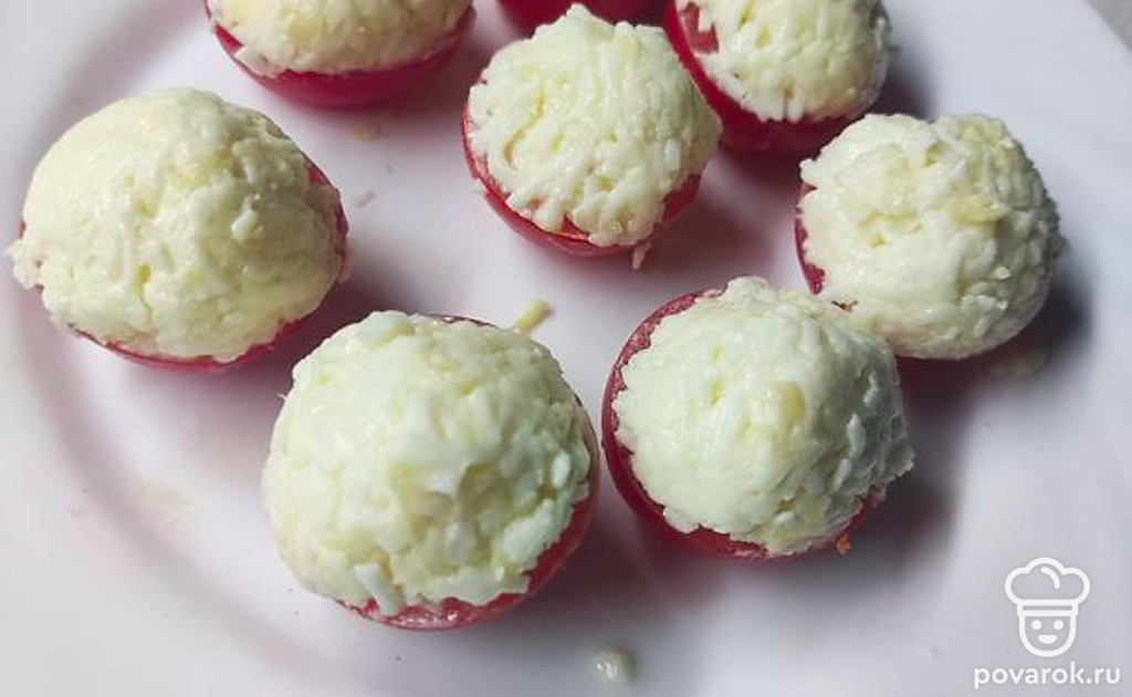 Смешать чеснок, майонез и сыр. Аккуратно чайной ложкой выложить смесь на каждую помидорку, формируя шапочку.