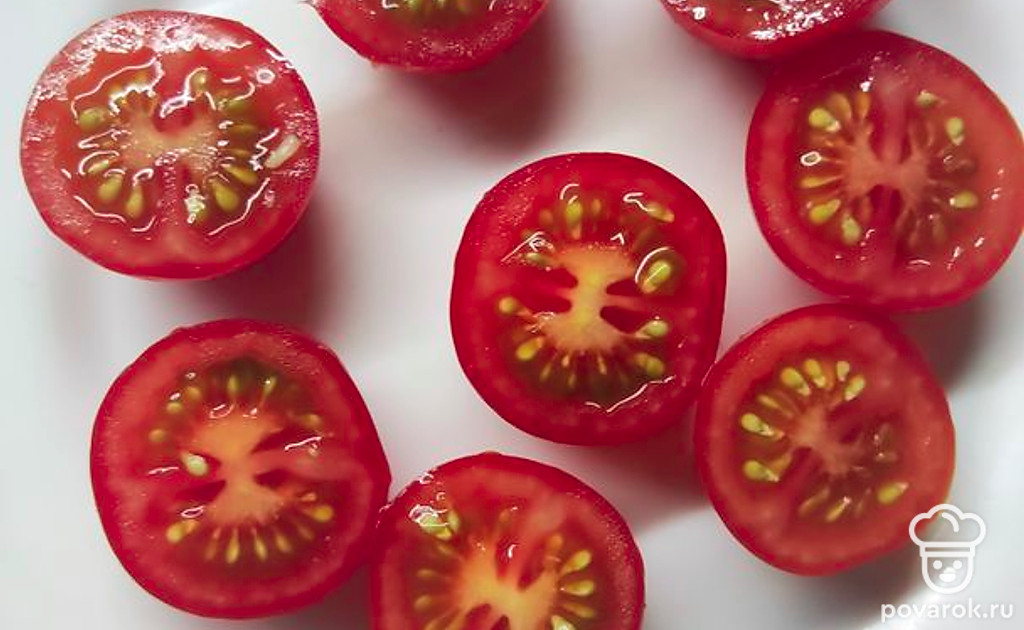 Поидоры черри помыть и разрезать каждую пополам.