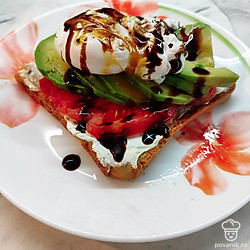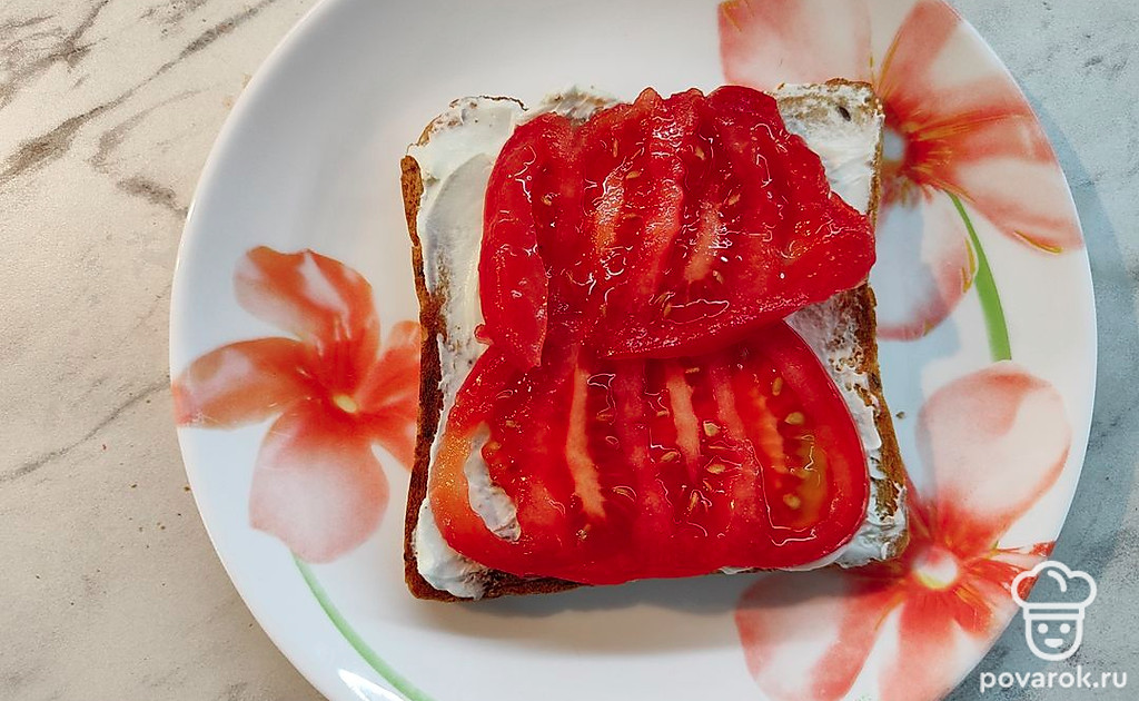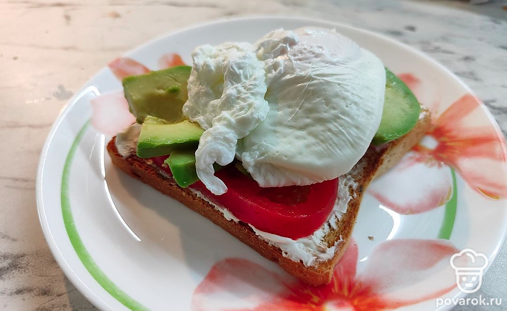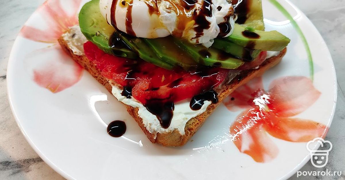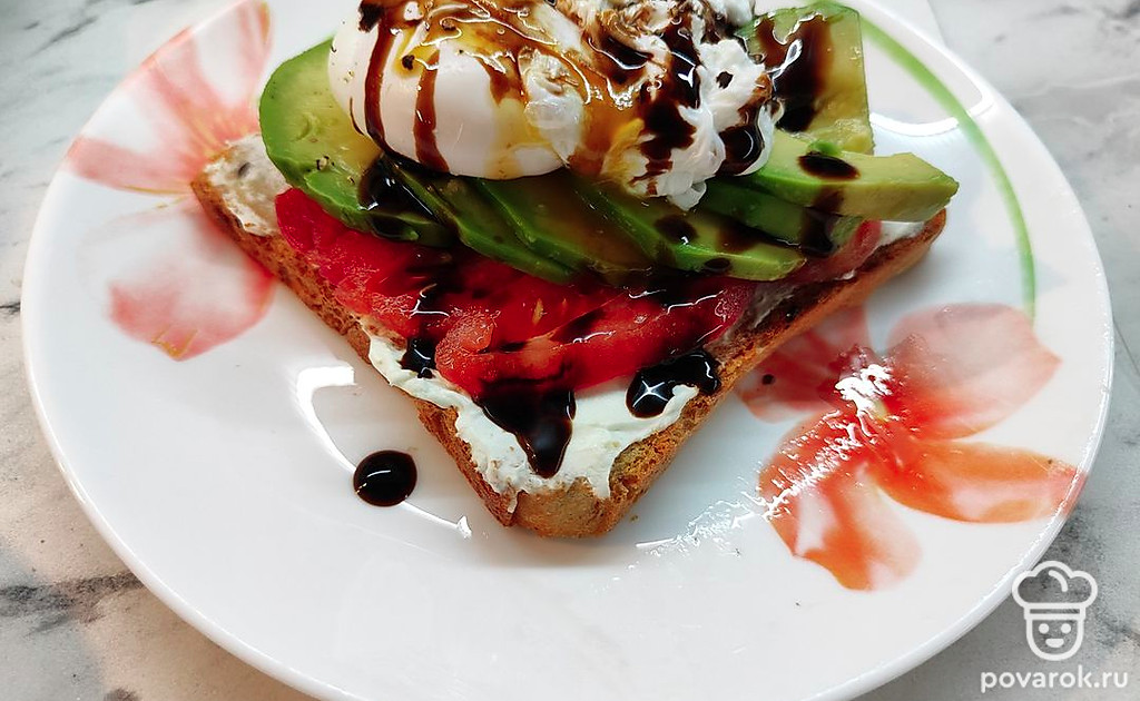 Поперчить по вкусу и сделать надрез на яйце, чтобы желток немного вытекал на бутерброд. Украсить по вкусу зеленью или бальзамическим соусом.