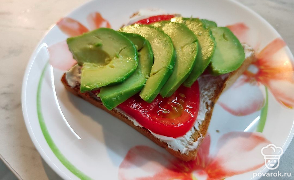 Почистить и нарезать авокадо, немного сбрызнуть лимонным соком. Выложить авокадо на помидор.