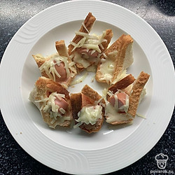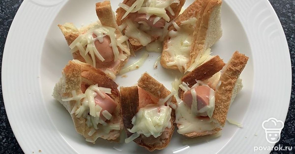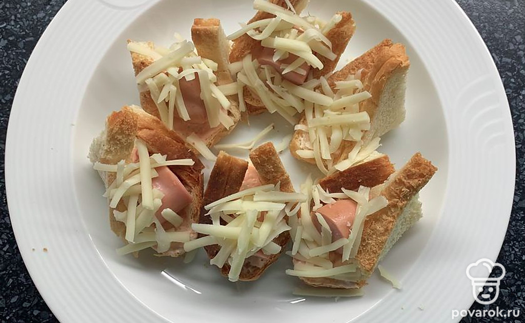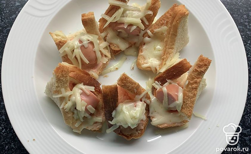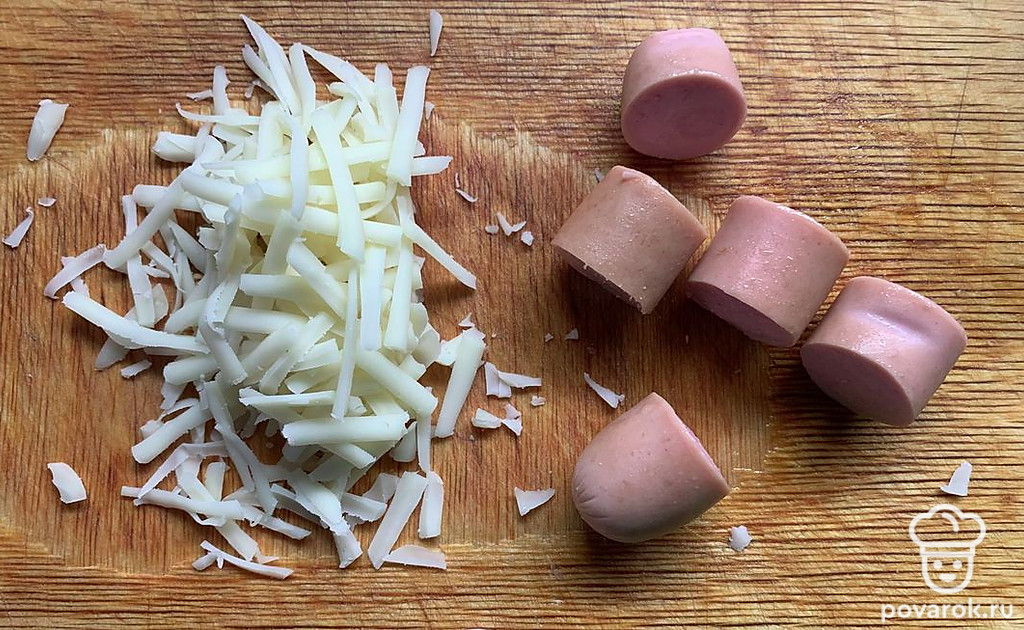 Выложить кусочки сосисок и сверху выложить сыр. Отправить на пару минут в микроволновку или духовку, чтобы сыр расплавился.