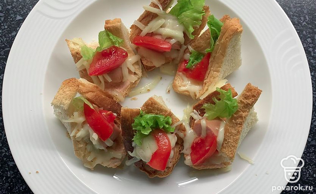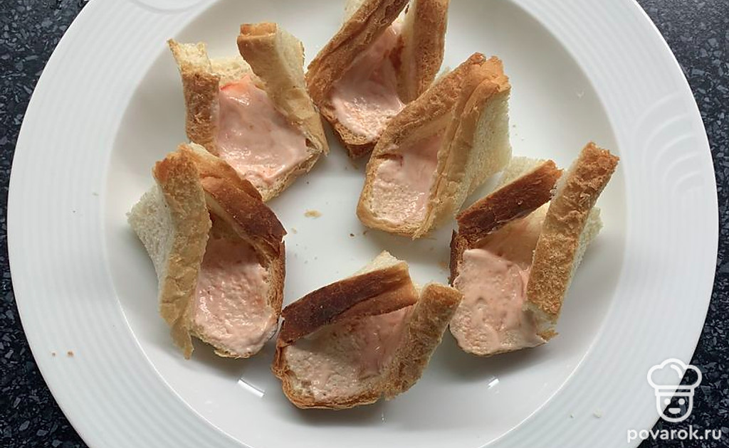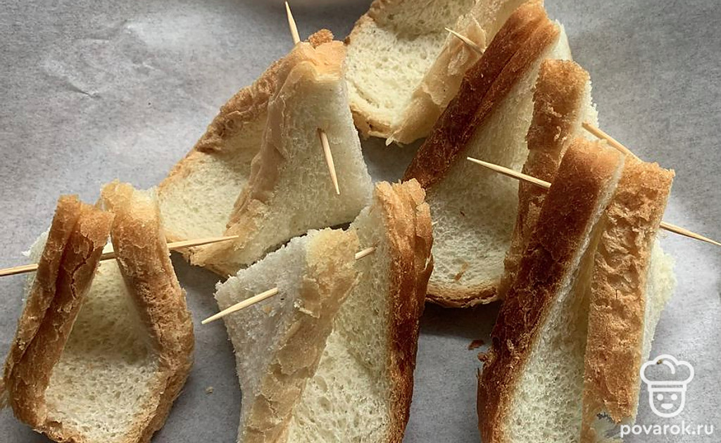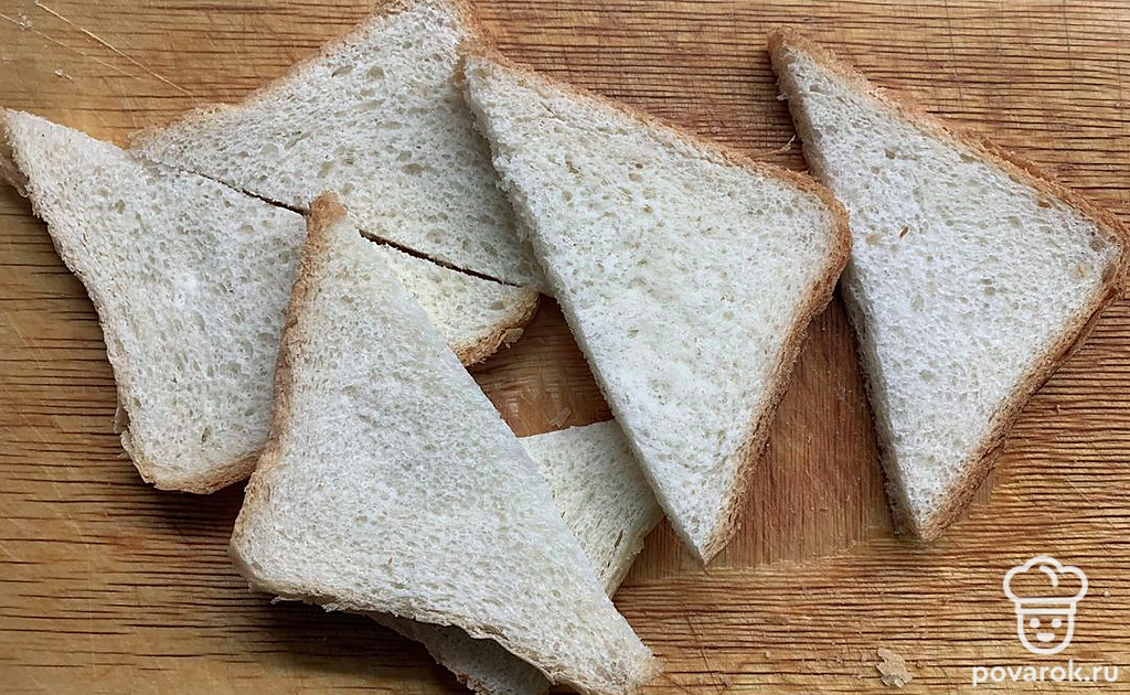Тостовый хлеб раскатать скалкой и разрезать на треугольники.