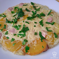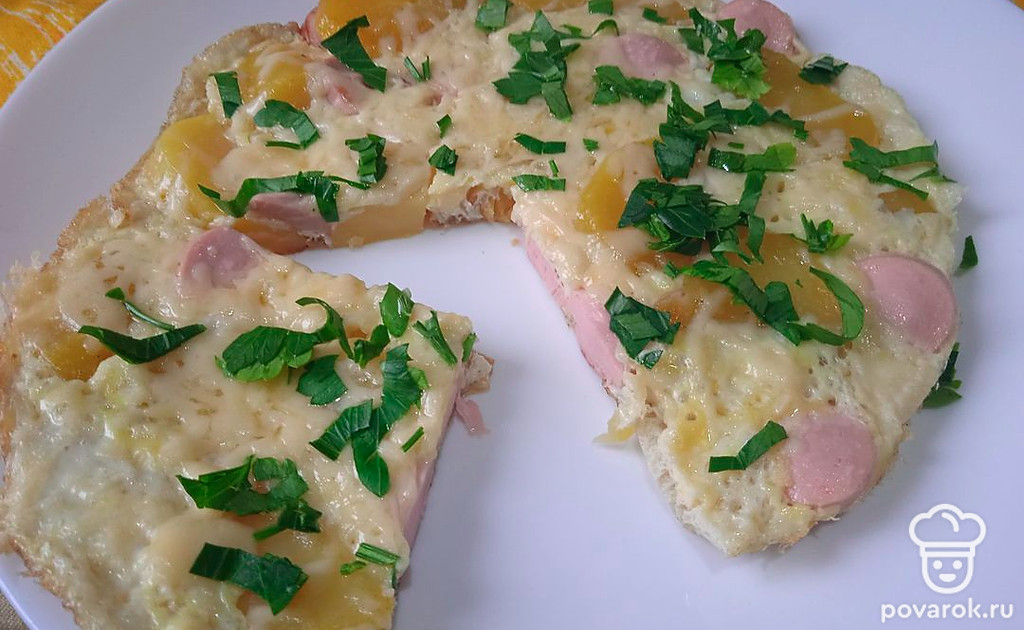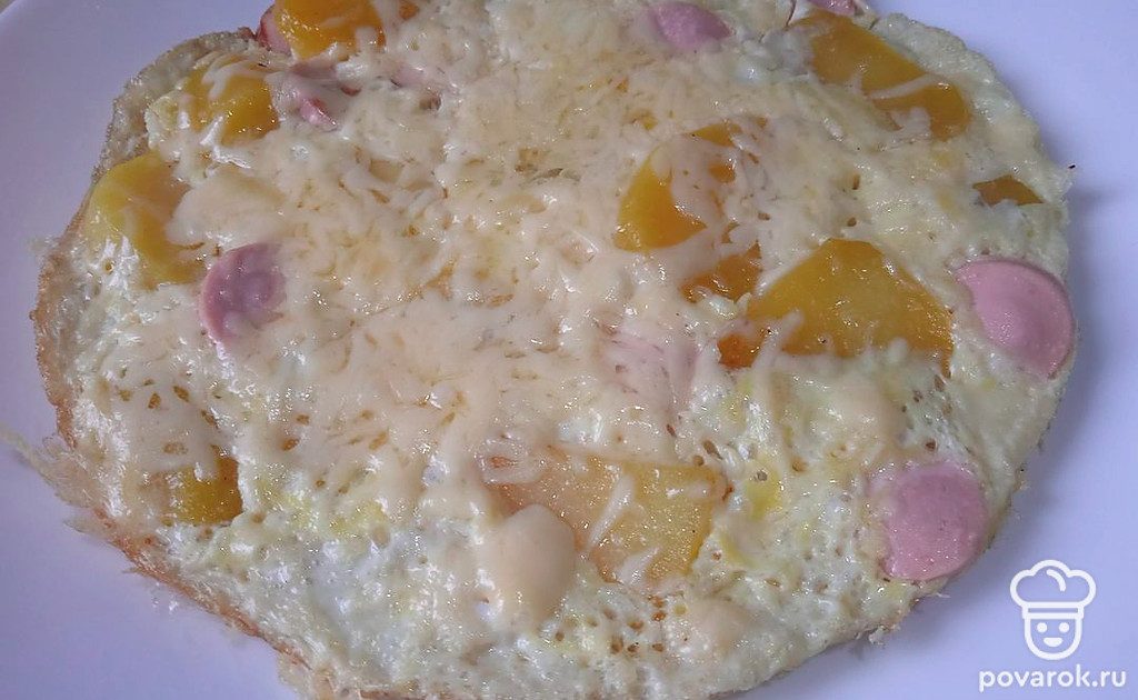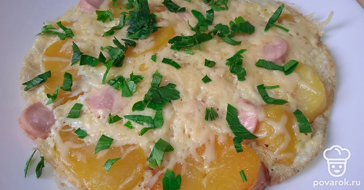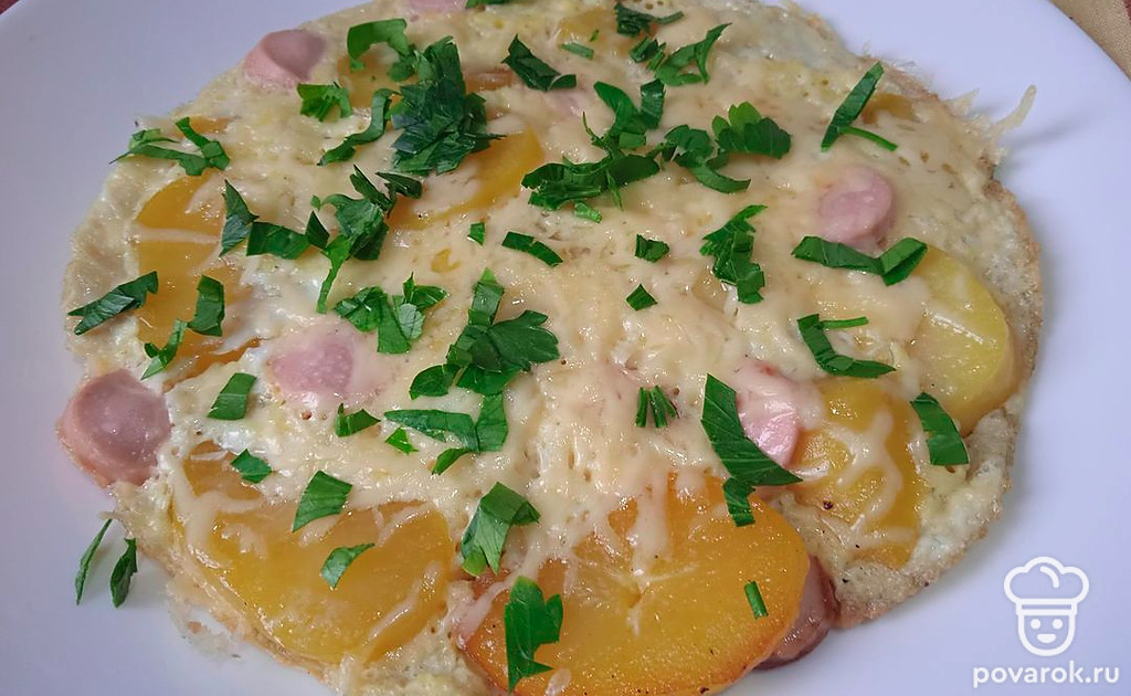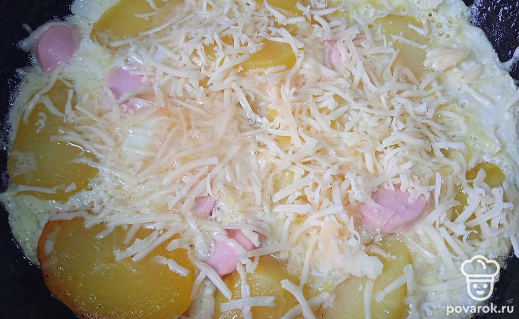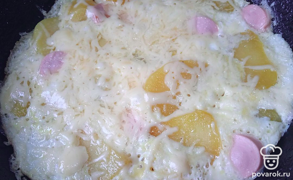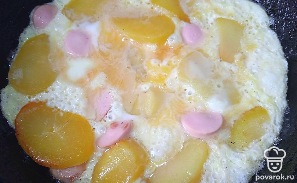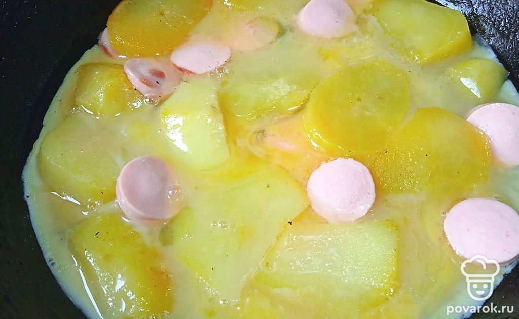 Переверните картофель и сосиски. Залейте взбитыми с солью яйцами. Накройте крышкой.