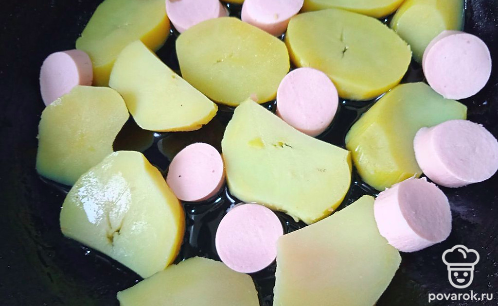Добавьте нарезанную сосиску. Обжарьте две минуты.