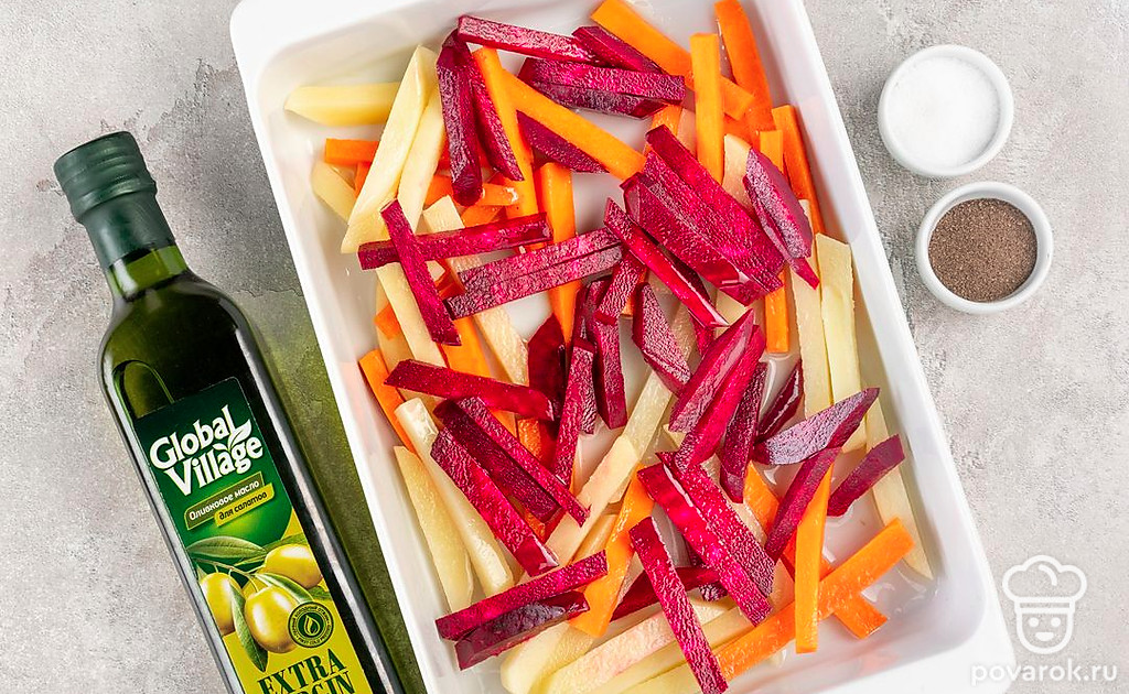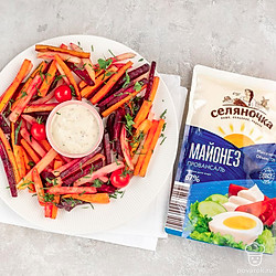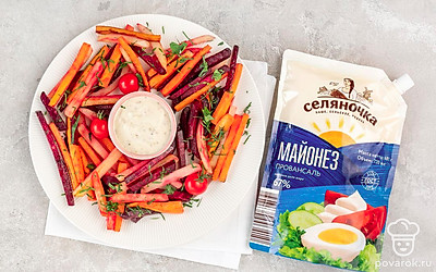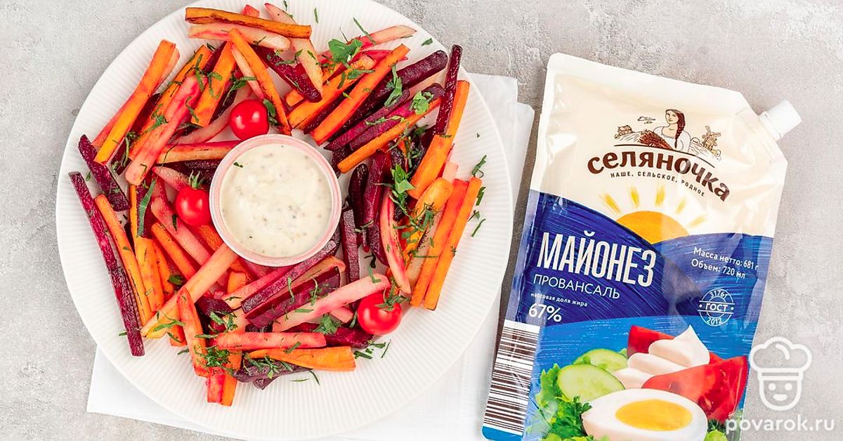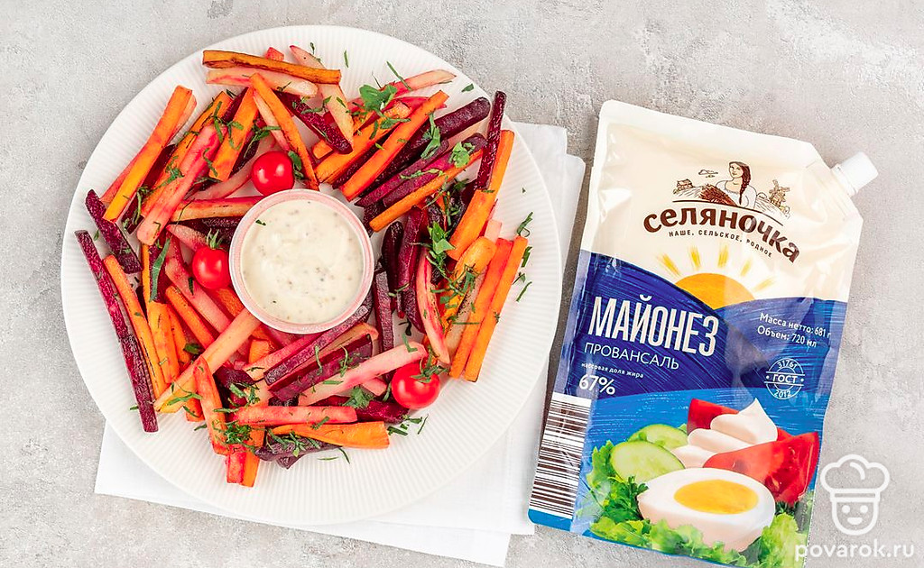 Полосочки различных овощей, запеченные до хрустящего состояния, не только невероятно вкусные, но еще и очень эффектно выглядят. Если для этого перекуса выбрать разноцветные овощи, получится красивая радужная тарелка. Ее можно подать к домашнему кинопросмотру с пикантным, слегка островатым соусом из горчицы с майонезом.