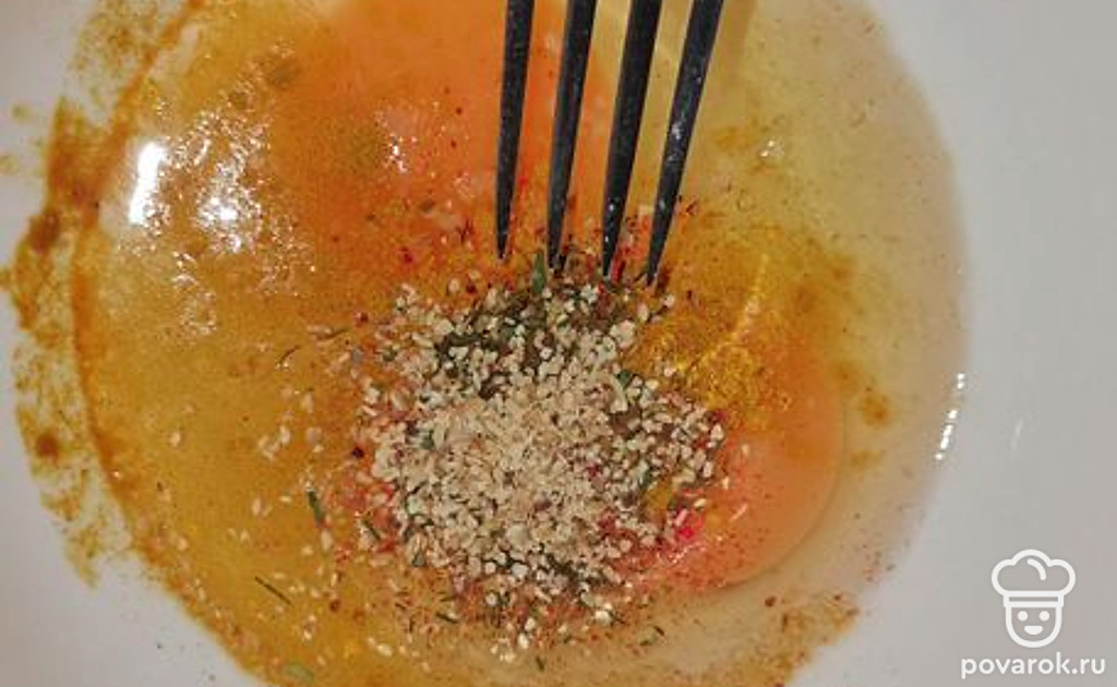В яйца добавить соль и любимые специи, взбить вилкой или венчиком.