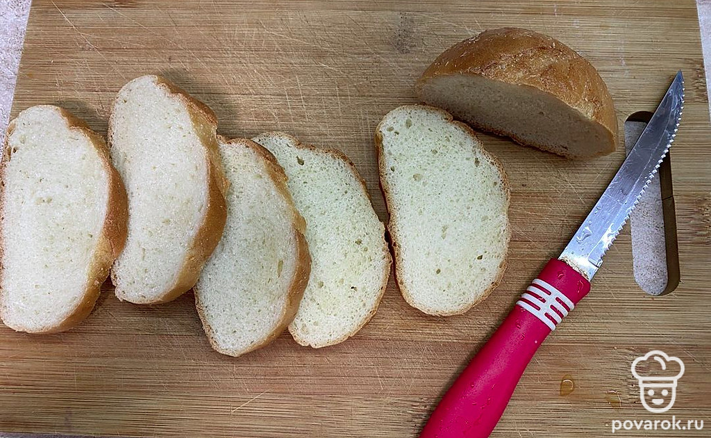 Нарежьте батон на ломтики толщиной 1,5 сантиметра.
