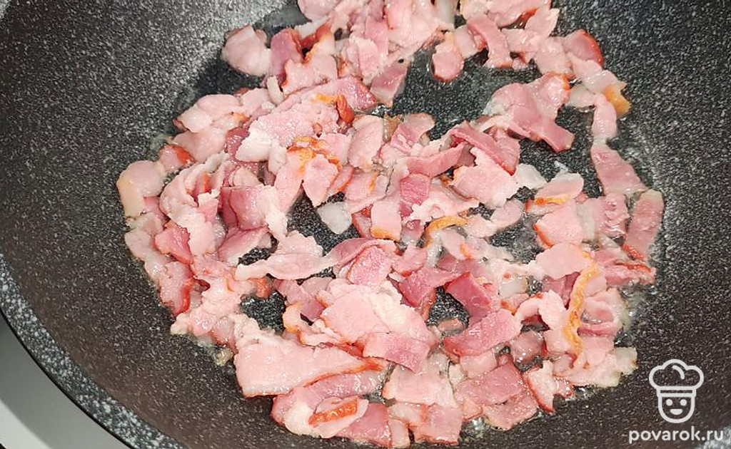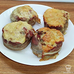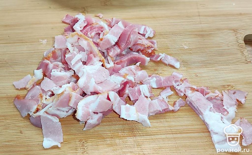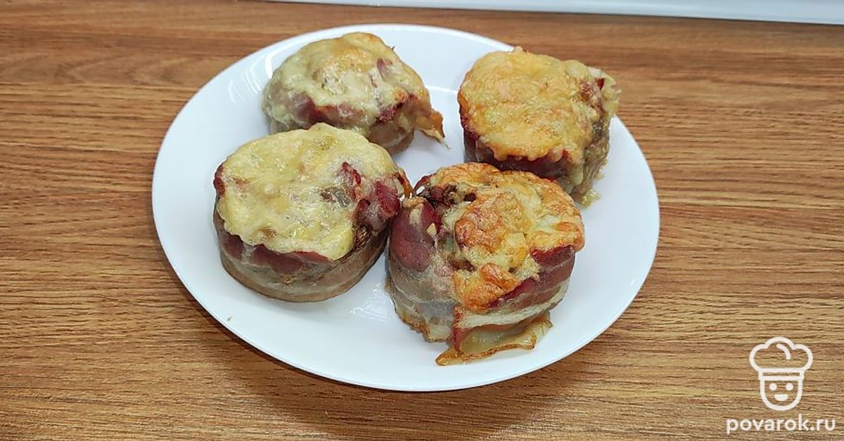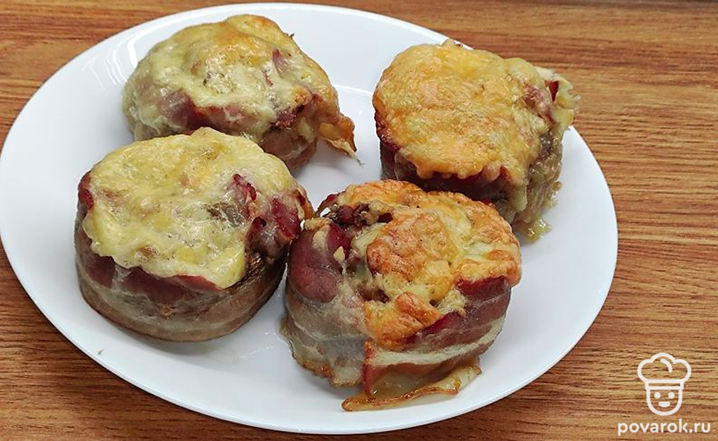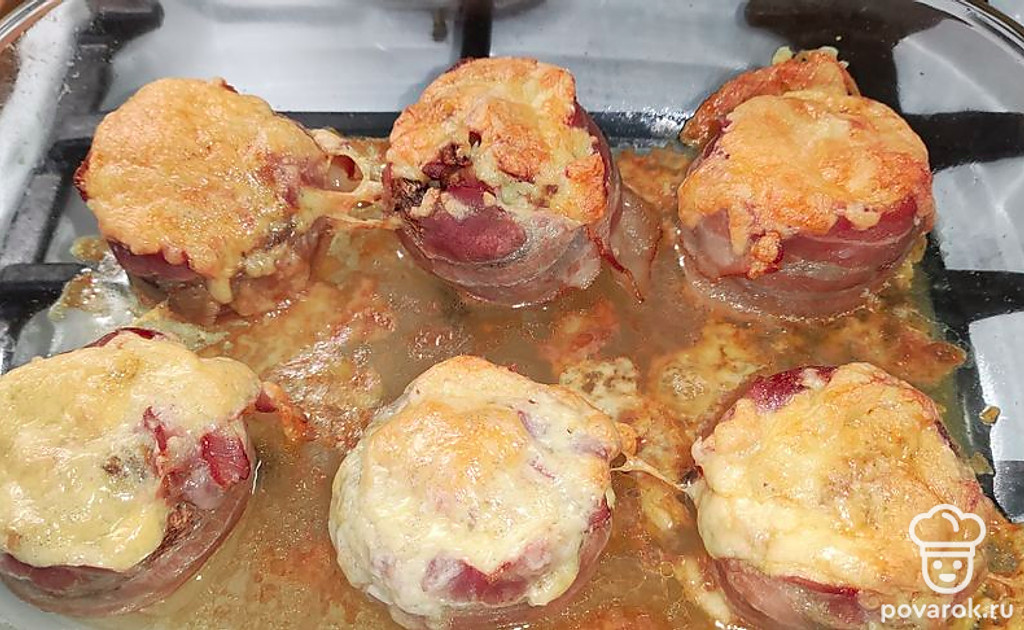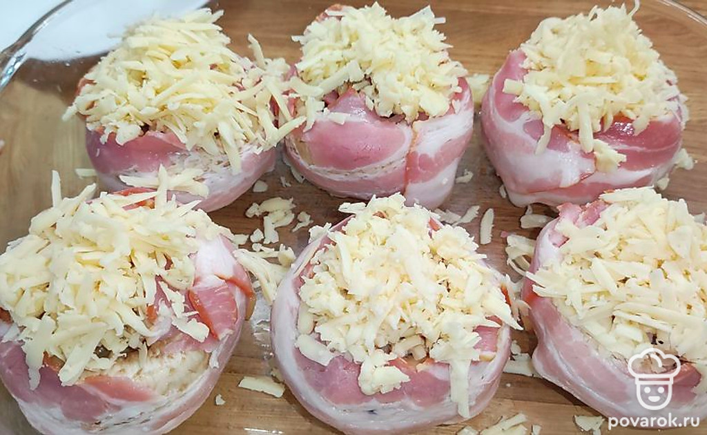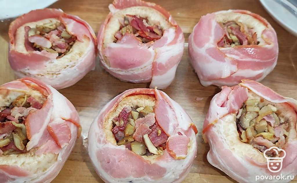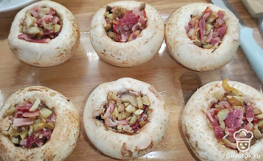 Грибы сложить в форму для запекания. Начинить грибы смесью с беконом.