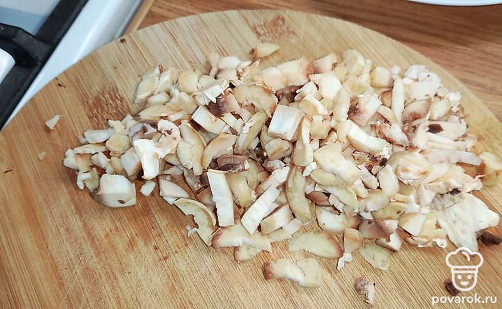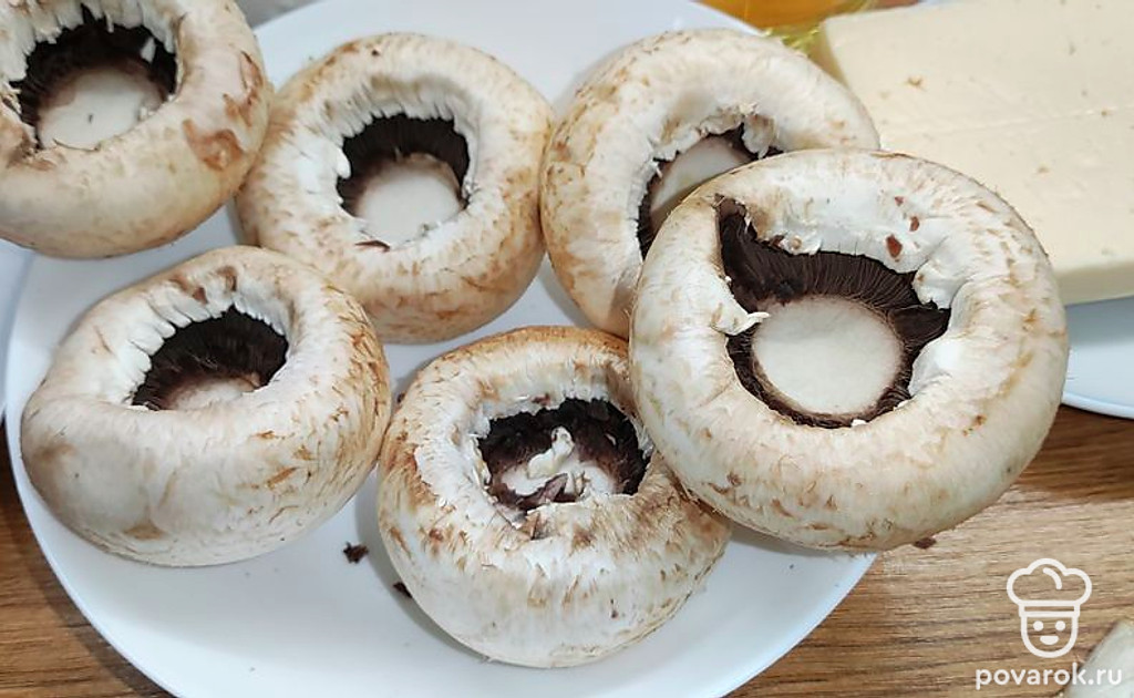 Грибы помыть, обсушить. Вырезать у грибов ножку, подрезать немного шляпку для ровной поверхности.