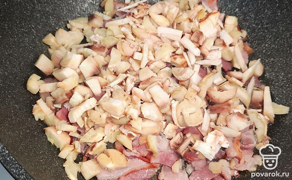 Добавить нарезанные грибы, обжарить начинку до готовности. По вкусу посолить.