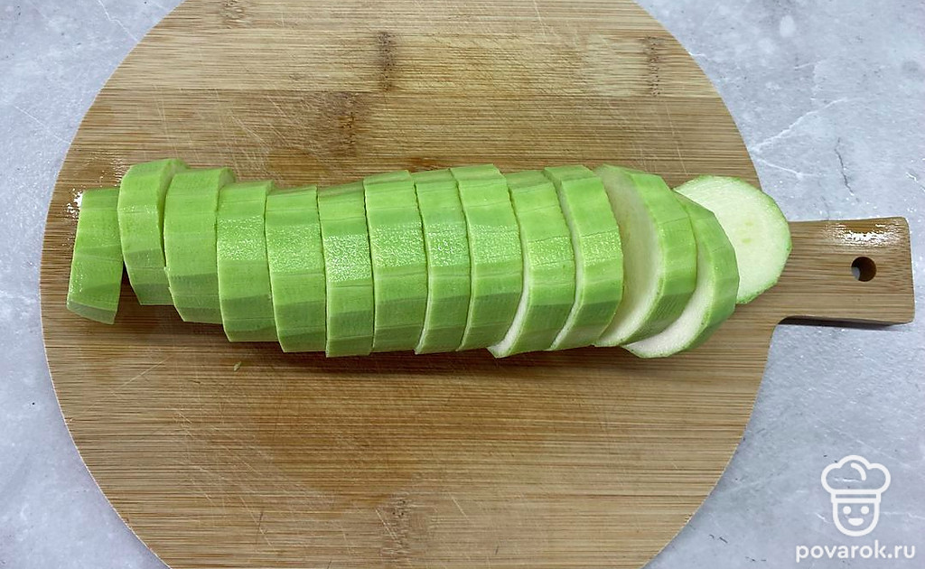 Кабачок очистить от кожуры, нарезать толстыми кружочками.