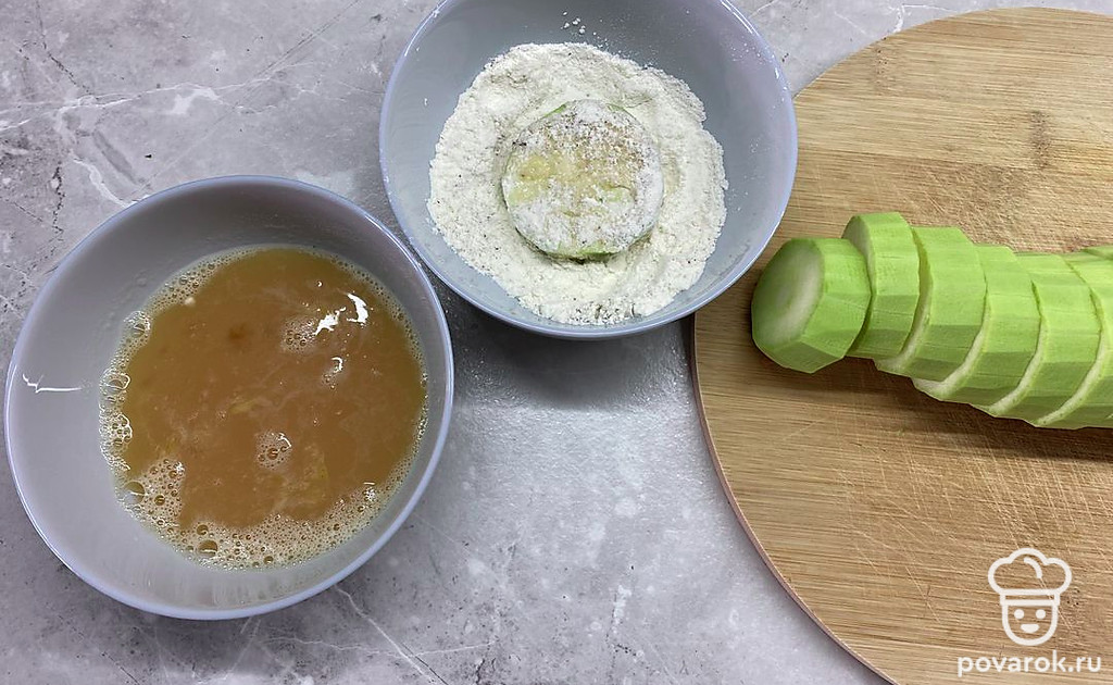 В одной миске взбить яйцо, в другой смешать муку с солью, черным молотым перцем и паприкой. Кабачок сначала обвалять в муке, потом обмакнуть в яйцо и опять обвалять в муке.