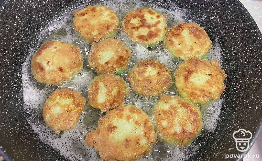 Обжарить кабачки на сковороде с растительным маслом до золотистого цвета с двух сторон.