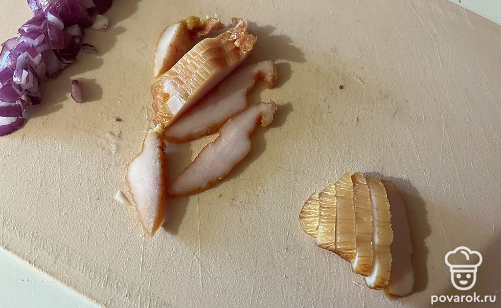 Грудку нарежьте тонкими слайсами.