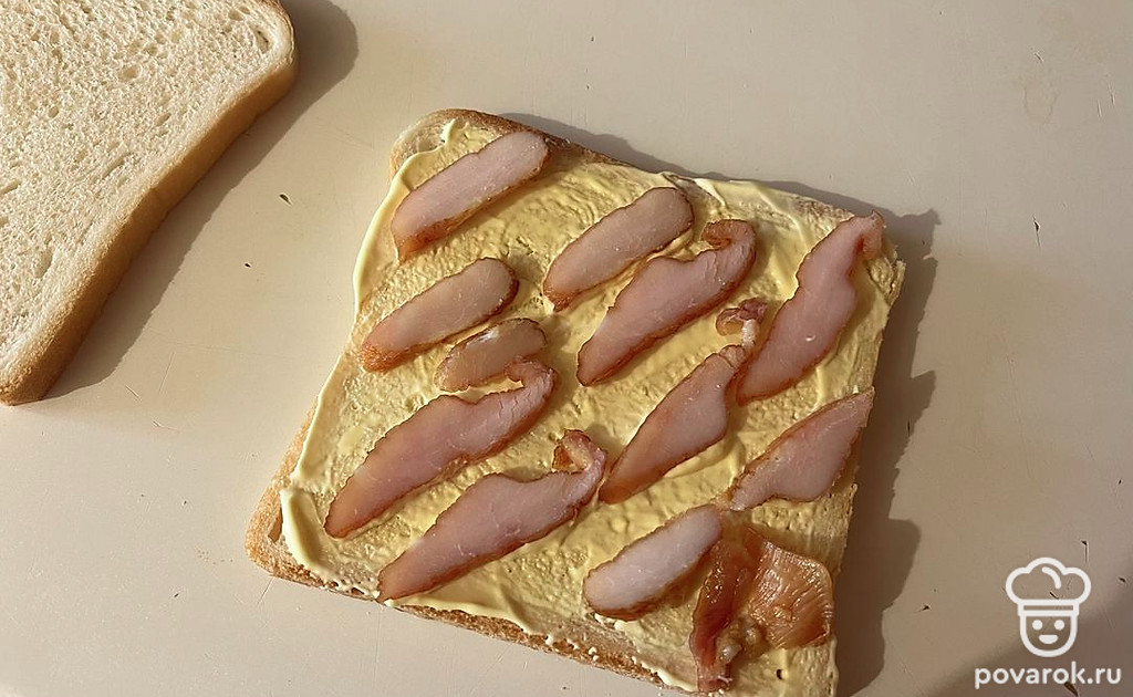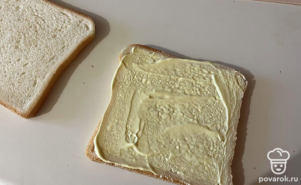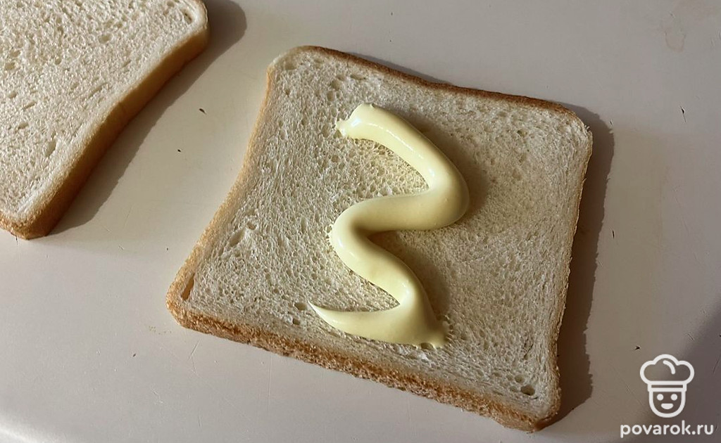 На один ломтик хлеба выложите майонез.