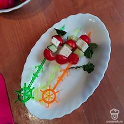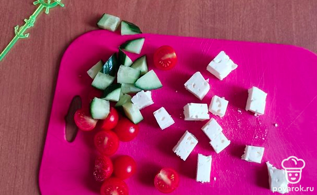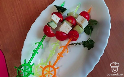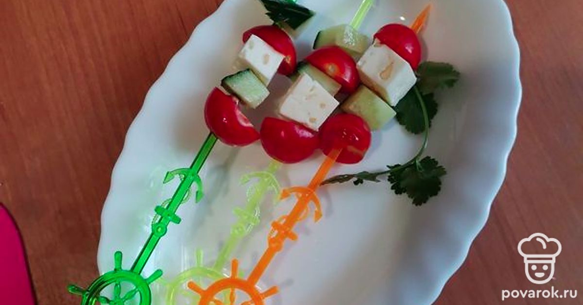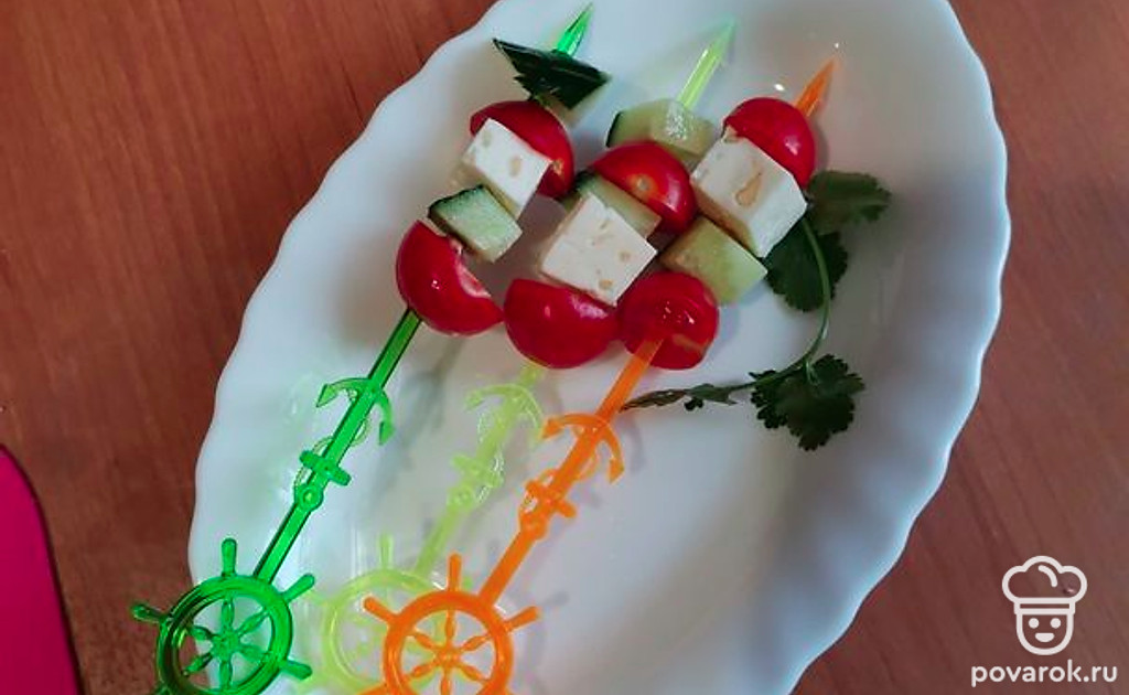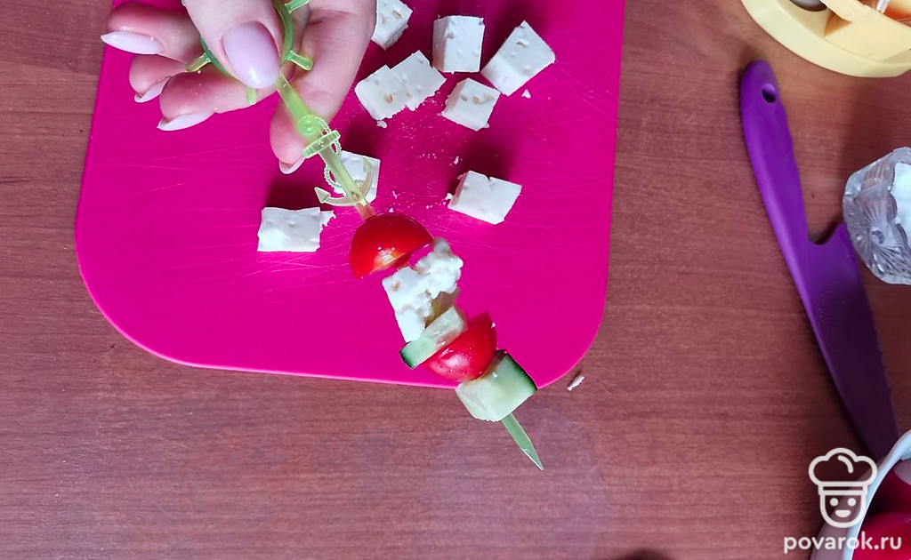 На шпажку поочередно насадите огурец, помидор и сыр.