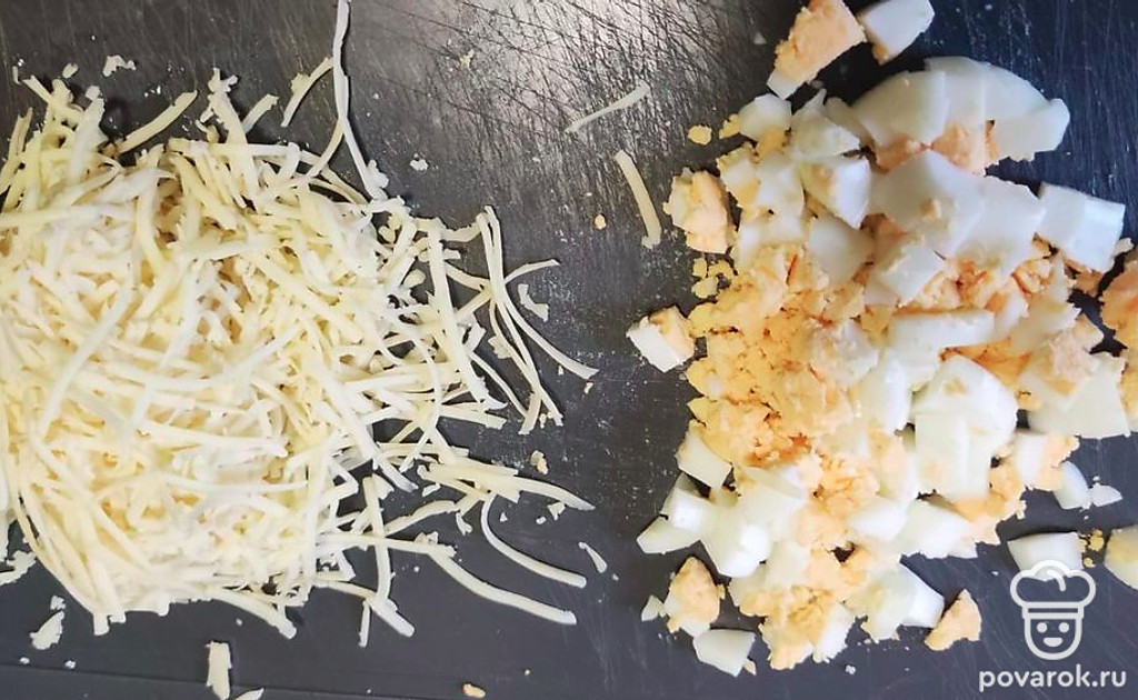 Яйцо нарежьте кубиком. Сыр натрите на мелкой терке.