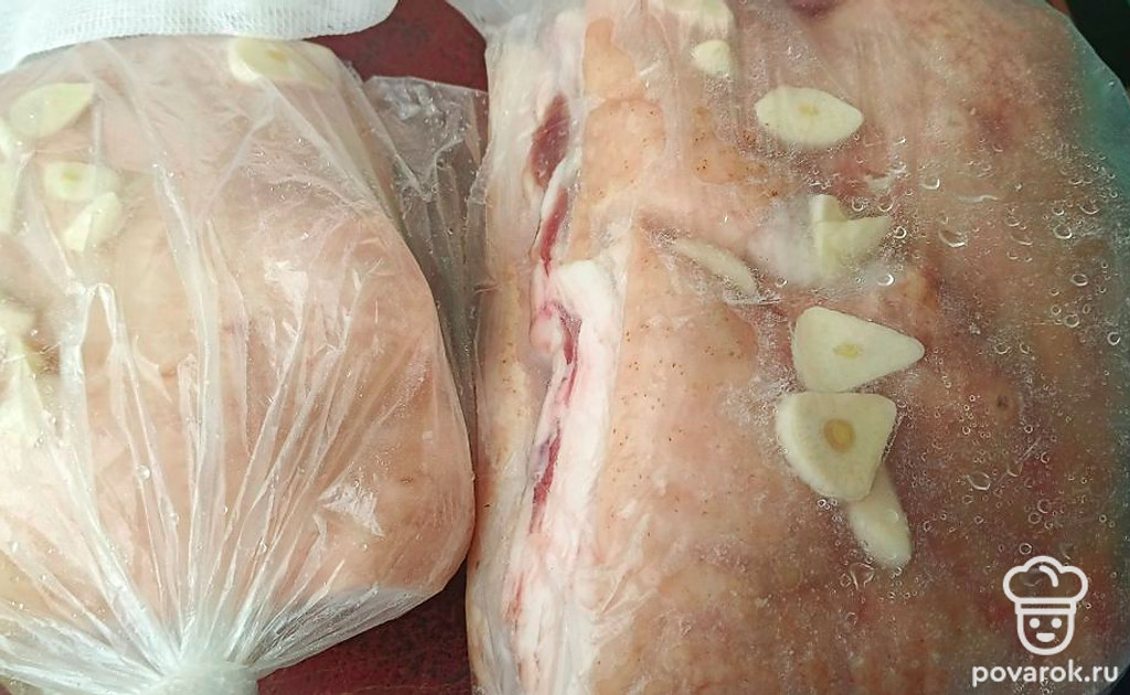 Предварительно посолите сало. Сало натереть обильно солью, добавить чеснок и положить а пакет. Оставить на 1-2 дня, в зависимости от размера куска.