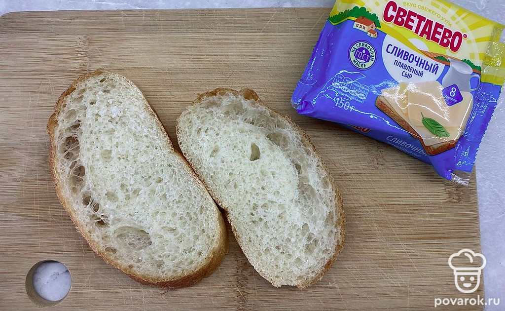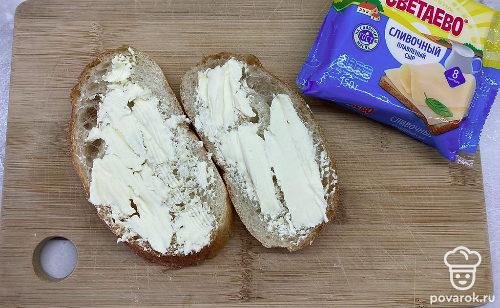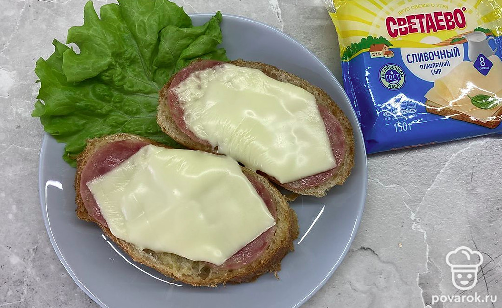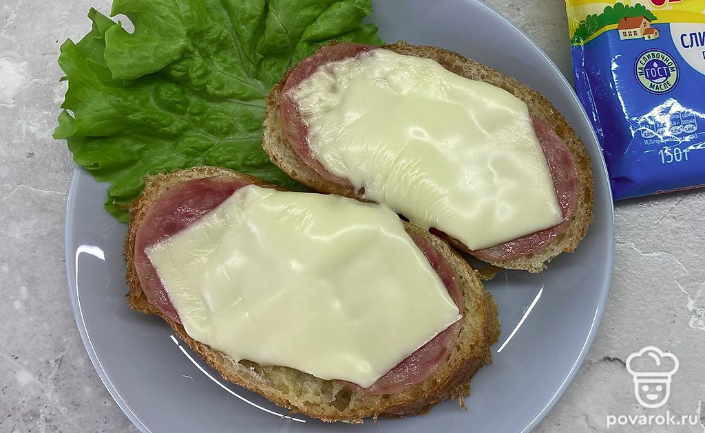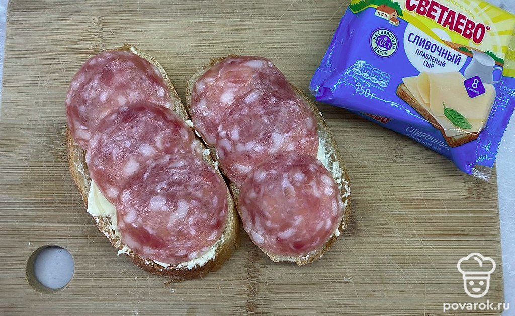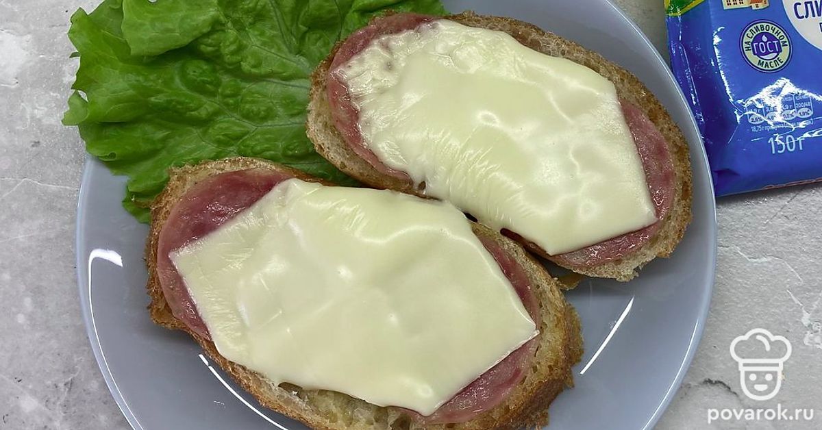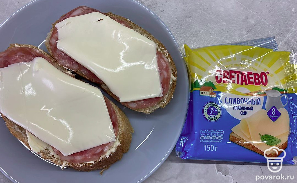 На колбасу выложить ломтики сливочного сыра. Запекать бутерброды в микроволновке 30 секунд.