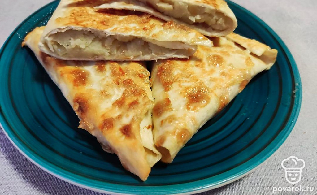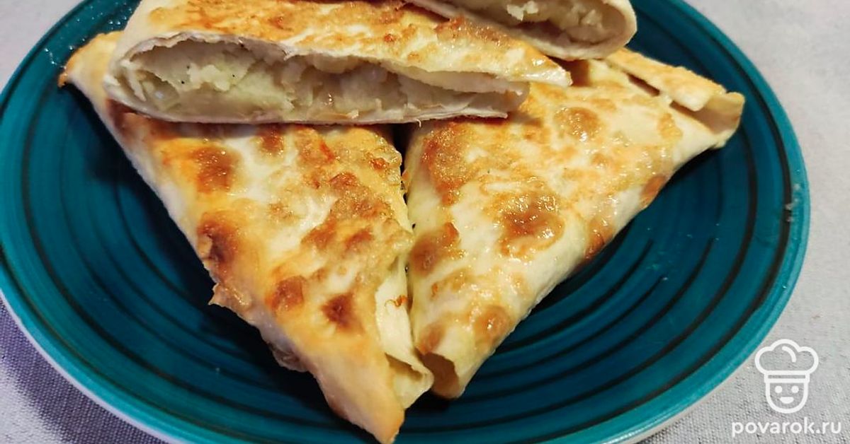 Выкладываем начинку на лаваш и сворачиваем его в треугольник.