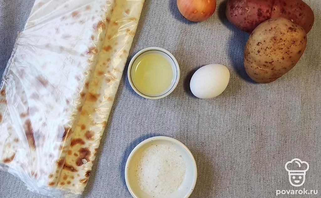 Подготавливаем продукты. Нарезаем лаваш полосками по 8-10 сантиметров в ширину. Разогреваем сковородку. Картофель моем и отправляем вариться в кожуре.