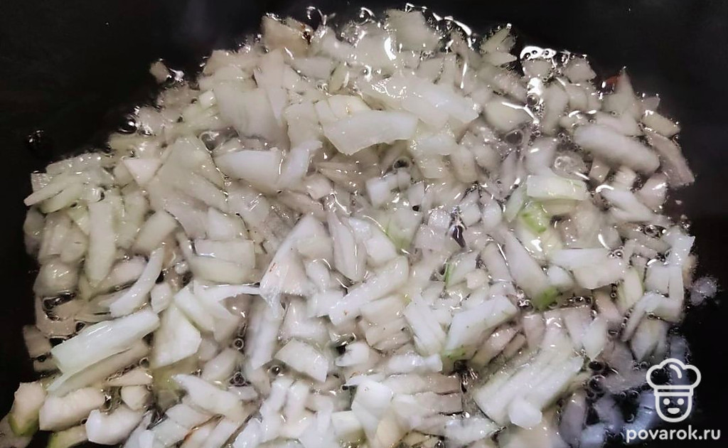 Лук шинкуем и обжариваем с двумя ложками растительного масла.