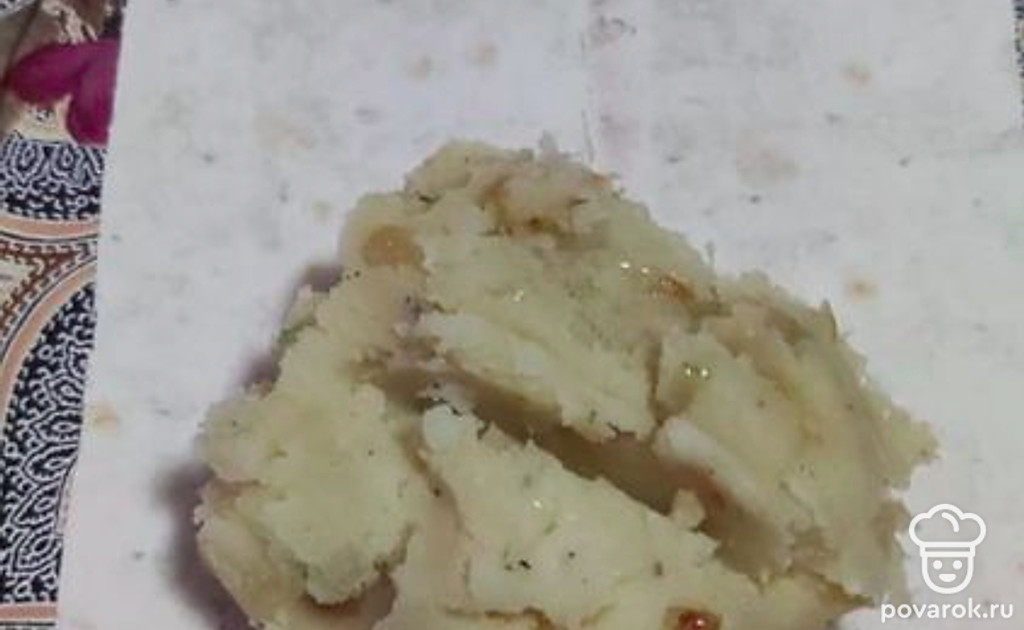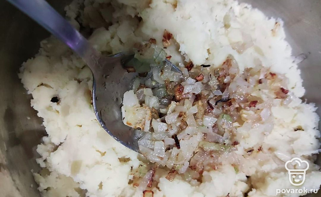 Готовую картошку чистим, разминаем в пюре, добавляем обжаренный лук. Солим начинку по вкусу.