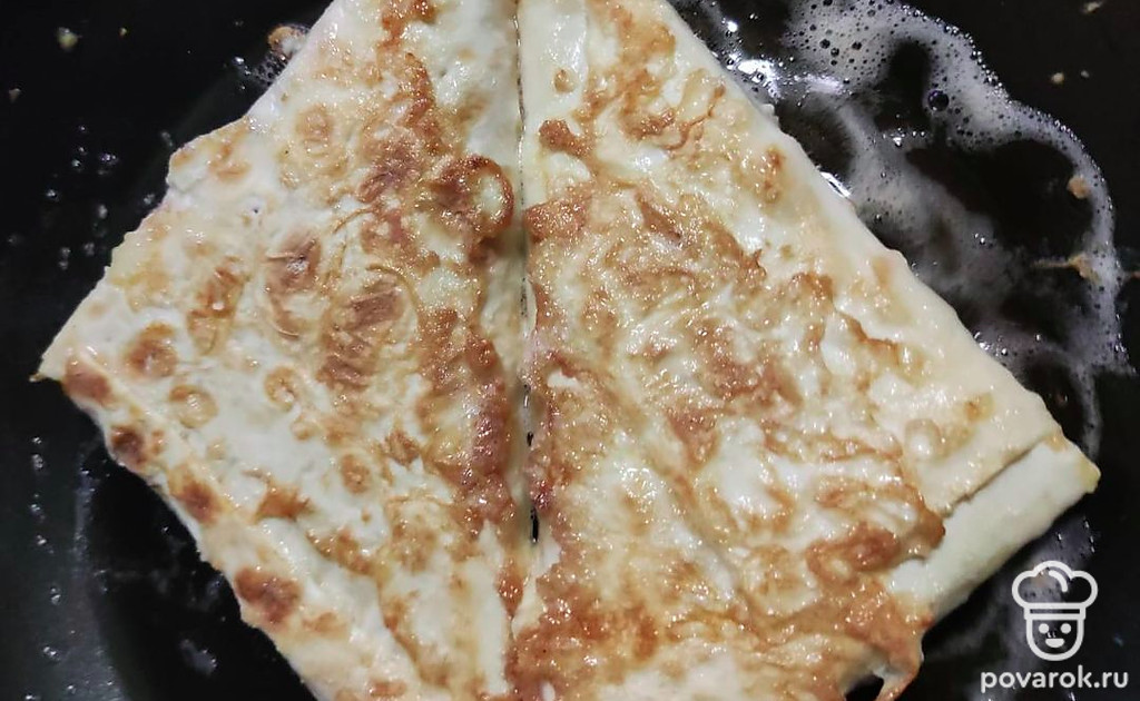 Окунаем треугольники с двух сторон в яйцо и обжариваем до золотистой корочки.