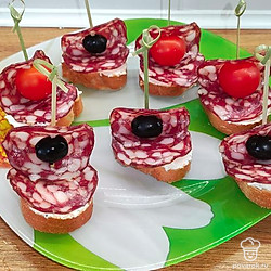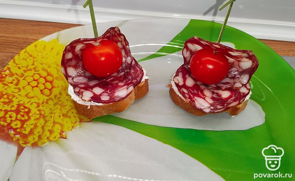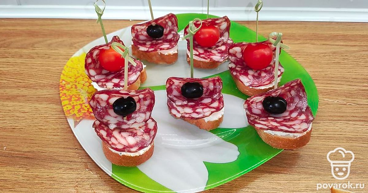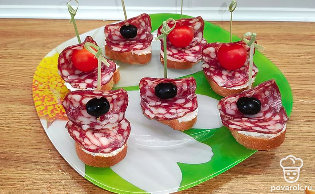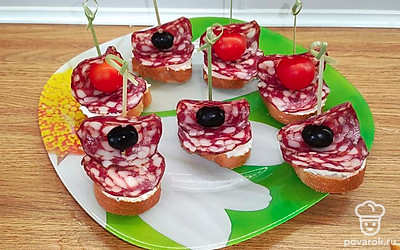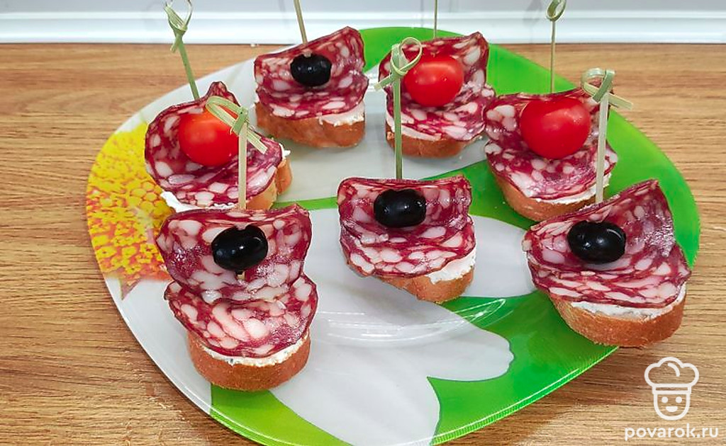 С помощью шпажки закрепить помидор или оливку, колечко огурчика. Все по вашему вкусу и желанию.