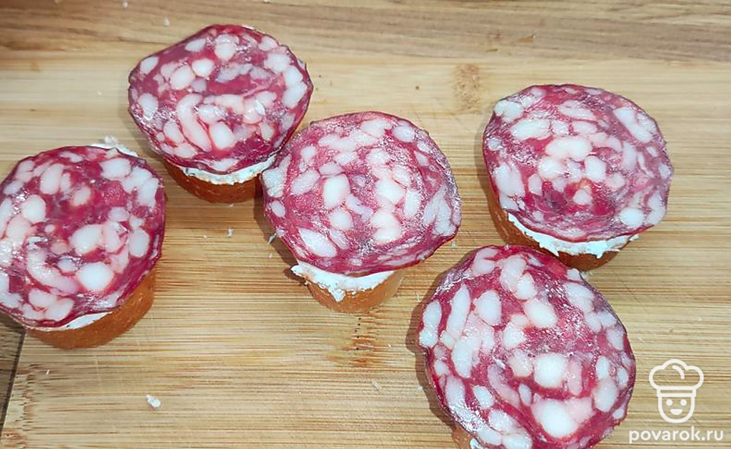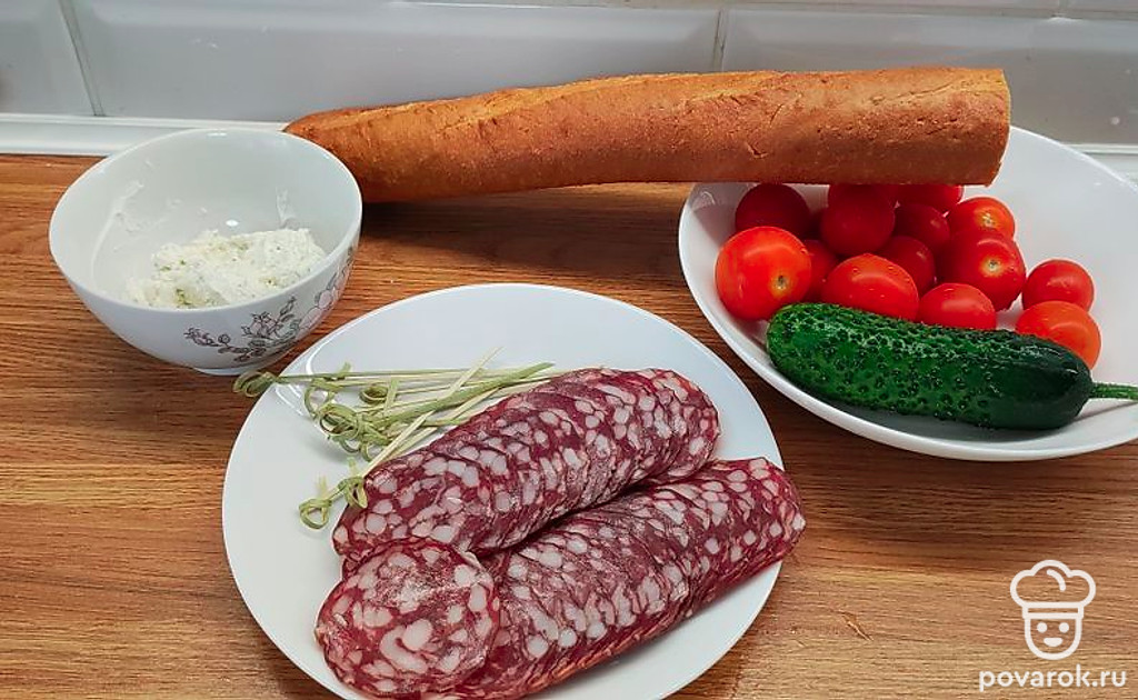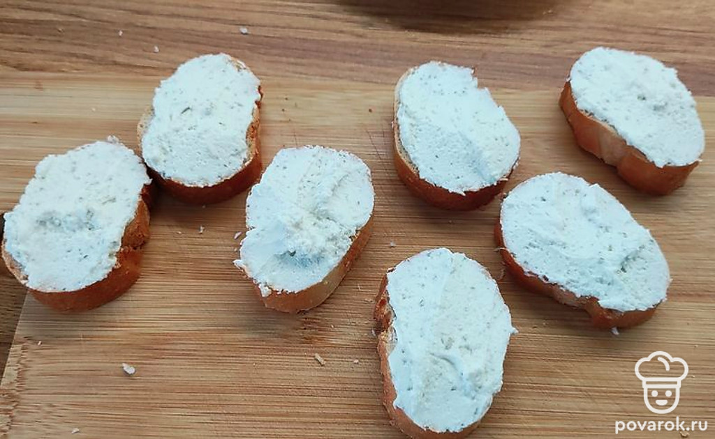 Багет нарезать порционными кусочками. Смазать его творожным сыром.