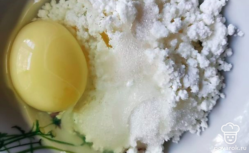 Творог смешайте с сахаром, ванильным сахаром и добавьте 1 яйцо.