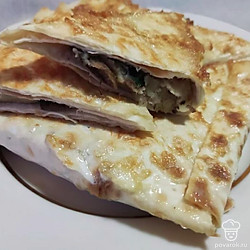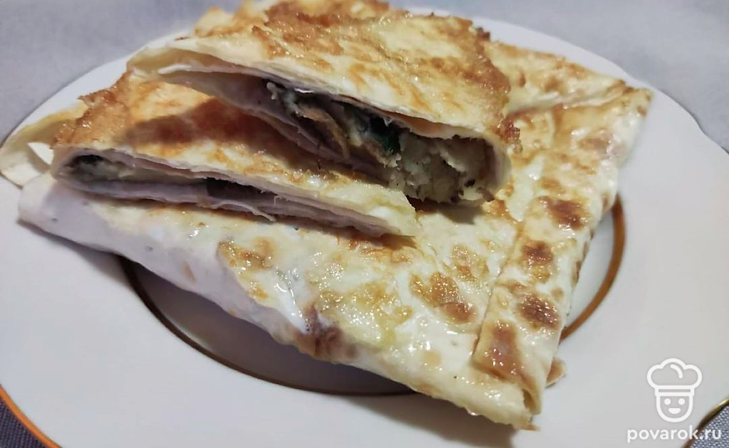 Выкладываем начинку на лаваш и сворачиваем в треугольник. Окунаем с двух сторон в яйцо и обжариваем до румяной корочки.