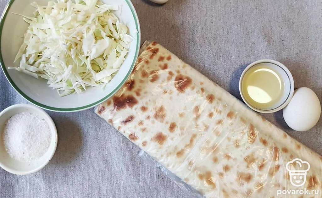Подготавливаем продукты. Нарезаем лаваш полосками по 8-10 сантиметров в ширину. Разогреваем сковородку, взбиваем 1 яйцо. Шинкуем капусту, отвариваем 1 яйцо.