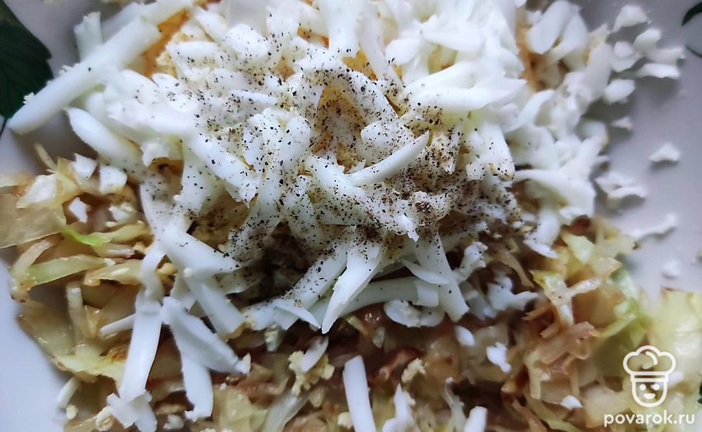 Яйцо натитраем на терке и смешиваем с готовой капустой.