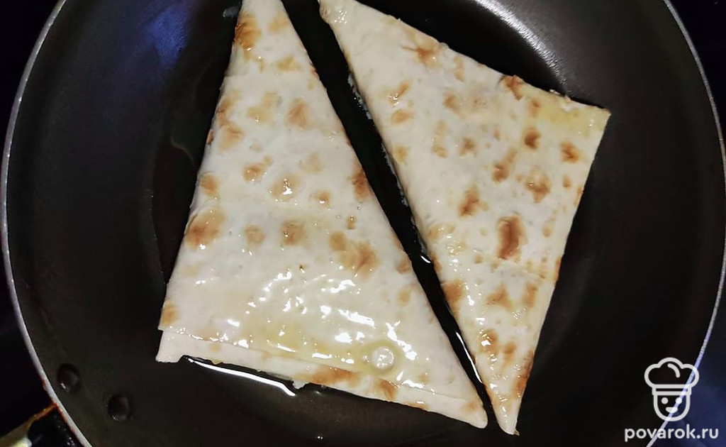 Обмакиваем треугольник с двух сторон в яйце и обжариваем до золотистой корочки.