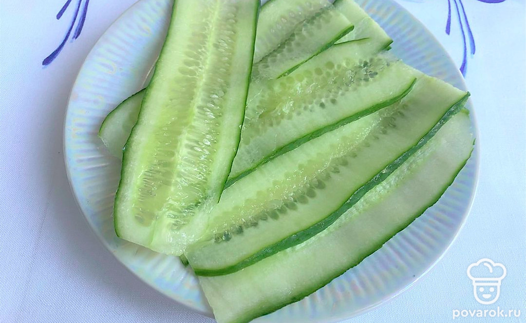 Помойте огурцы, отрежьте кончики. С помощью овощечистки нарежьте огурец слайсами.