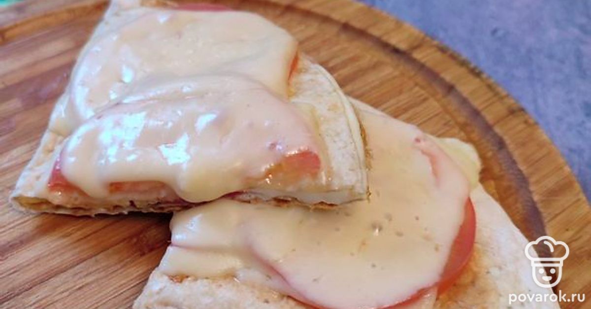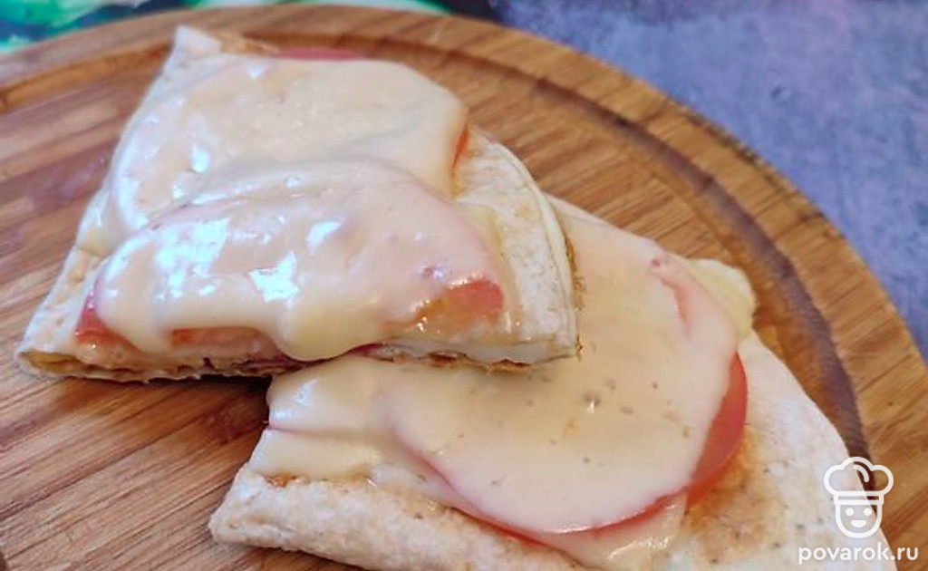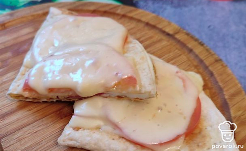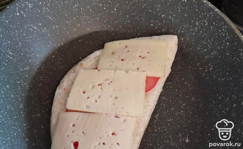 Переворачиваем и сверху выкладываем сначала ломтики помидора, а затем сыр. Снова накрываем крышкой и ждем, пока сыр сверху не расплавится.