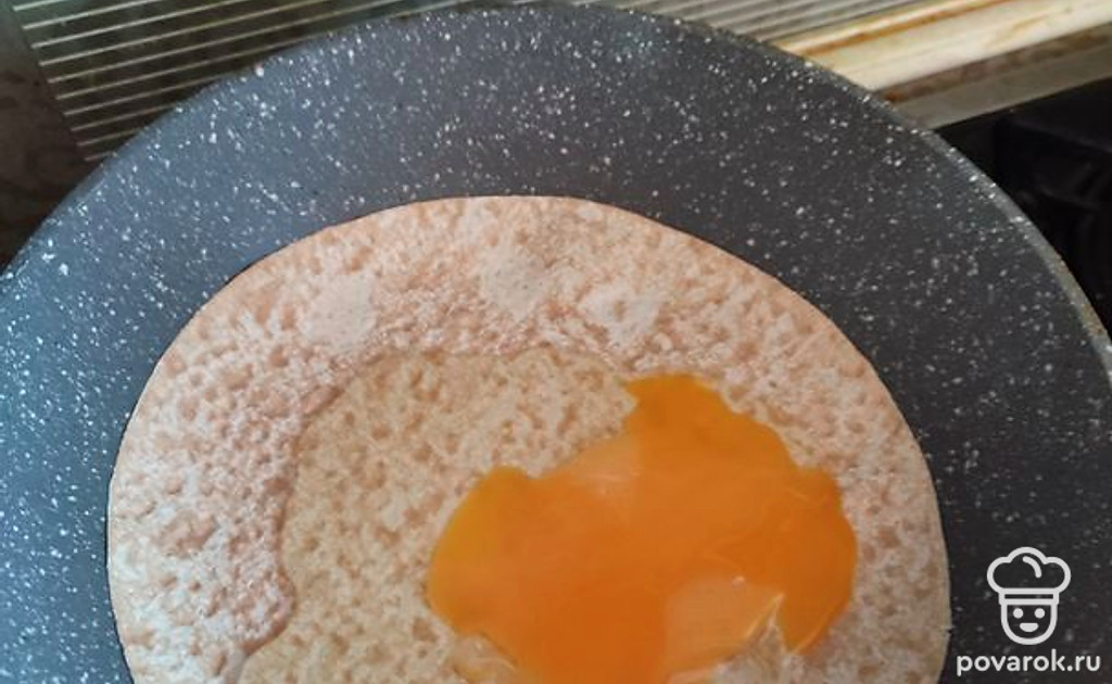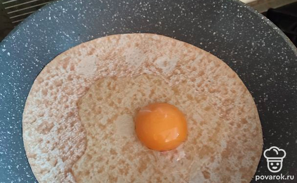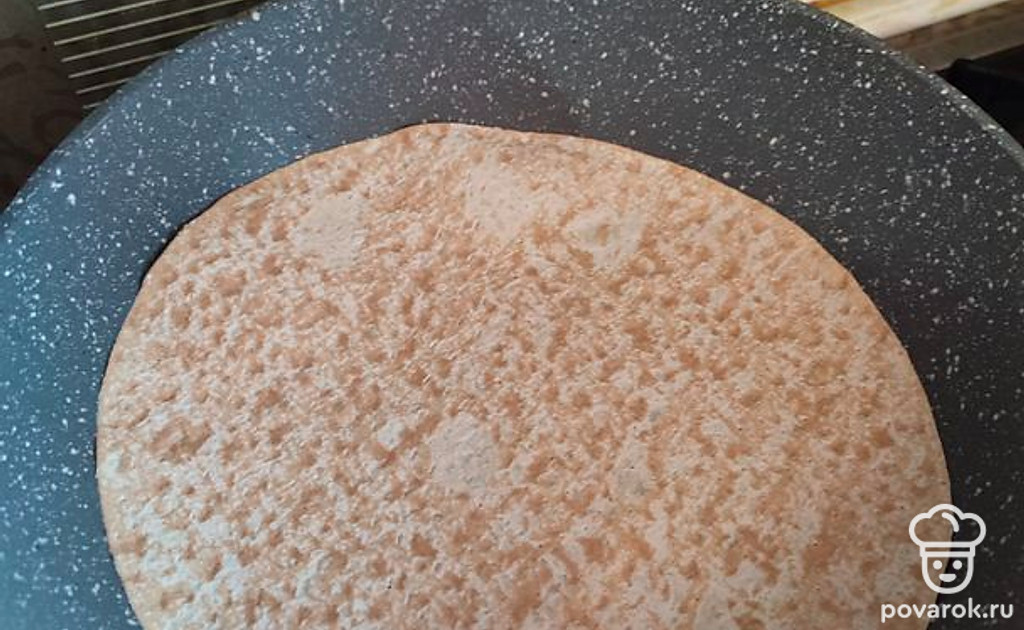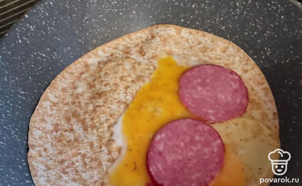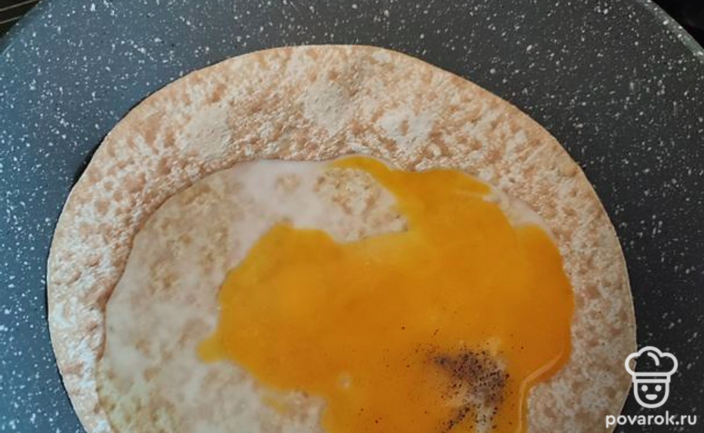 Складываем лаваш пополам, накрывая начинку второй половинкой круга. Получается полукруг, как на фото. Накрываем крышкой, убавляем огонь на плите до минимума. Ждем минуты 3.