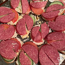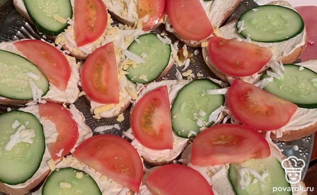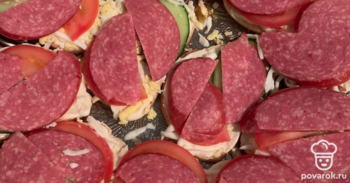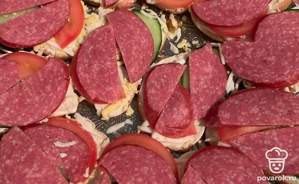 Сверху раскладываем кусочки колбасы. Бутерброды на скорую руку готовы. Можно подавать на стол.